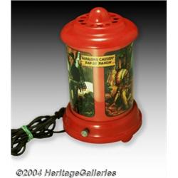 <B>Hopalong Cassidy Revolving Roto-Vue Lamp (Econolite, circa 1950).</B></I> This highly prized Hopalong Cassidy collectible is a revolving 3-D style lamp. This electric lamp stands approximately 9.5" tall, and is in Excellent condition, unlike many of these lamps, which experienced a brown discoloration from the heat of the light bulb. As the lamp spins, 3-D-like Hopalong Cassidy scenes change before your eyes. In one scene, Hoppy is at the campfire with an Indian Chief in full head dress. In another, he's caught up with bandits at their campfire. Hoppy's guns are drawn, and the owlhoots have their hands in the air. On two sides of the lamp, there's a Western-style sign that says "Hopalong Cassidy Bar 20 Ranch." William Boyd played Hopalong from 1935 until his retirement in 1959. He appeared in over 100 Hopalong Cassidy films, and was featured in comic books, newspaper strips, on the radio, and as early television's first Western star. Practically every kid in America followed his exploits during the late 1940s and '50s; his popularity spawned many licensed items like this lamp, one of the most desirable Hopalong items. <BR><BR><B>Important notice:</B> Heritage usually auctions material at the rate of 200-250 lots per hour. On some occasions eBay Live bid software or the Internet may not be able to keep up with the pace of the auction. We recommend placing a realistic absentee bid now as insurance to avoid disappointment. Occasionally the auctioneer may eliminate or reject an eBay Live bid, and the auctioneer may also reopen a lot after the close of the eBay live bidding (usually because we missed an audience bid), and may reject your bid even if it shows you as the winning bidder. By bidding via eBay Live, you agree that Heritage may award the lot to another bidder at its sole discretion under the circumstances described above or any other reasonable circumstances. Since eBay bids are not shown to us until we open the lot on the floor, we treat those bids just like floor bids. In most cases the floor responds before the eBay bid is presented to us, due to Internet lag time, so for consistency we have made it a policy that floor bids are always considered first over tie eBay live bids. Also please note that all Heritage lots purchased through eBay Live carry a 20% Buyer's Premium. Please make sure you read the Terms and Conditions before you bid.
