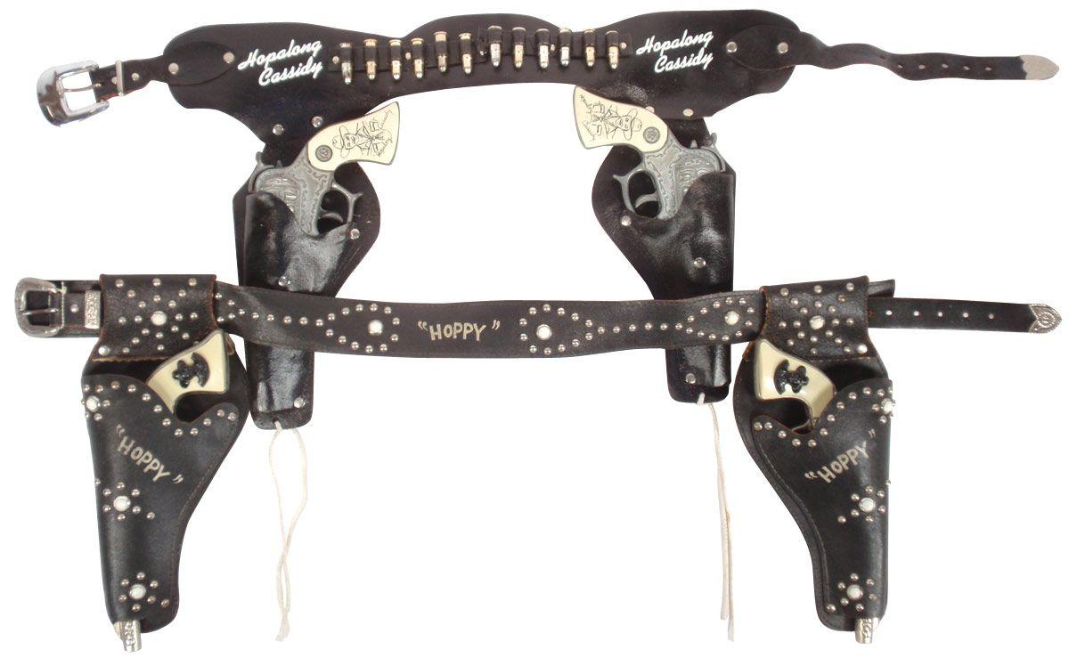 Hopalong Cassidy double holster w/orig guns, Wyandotte, c.1940, licensed complete set, Exc orig cond w/plastic split in bullet strap & "Hoppy" Buck'n Bronc double holster, 1 break in plastic grip o/wise Exc cond, 30" waist.