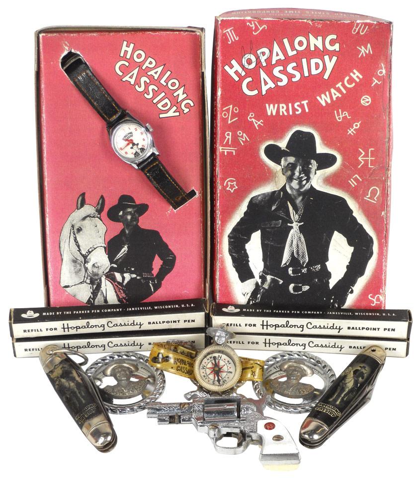 Hopalong Cassidy items (11), includes U.S. Time wrist watch in box, compass, small cap gun, bolos, (2) pocket knives & (4) ball point pens, watch box has been written on, o/wise all in Exc cond.