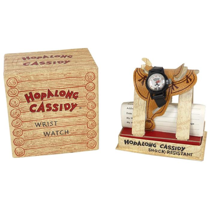 Hopalong Cassidy wrist watch by U.S. Time Co., watch on saddle display w/papers, c.1950's, Exc cond.