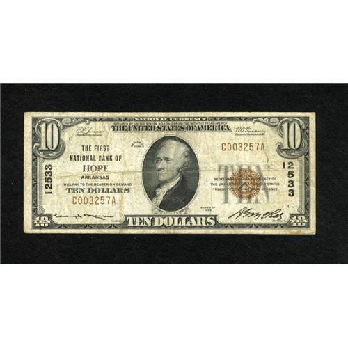 <B>Hope, AR</B></I> - $10 1929 Ty. 1 <B>The First NB</B></I> Ch. # 12533<BR>An evenly circulated example from Hope's last issuing bank, which circulated Series 1929 notes only. <B>Very Good-Fine.</B></I><BR><BR><b>Shipping:</b> Coins & Currency (<a target="_blank" href="http://www.heritageauctions.com/common/shipping.php">view shipping information</a>)