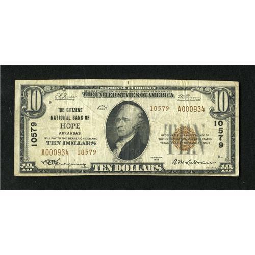 <B>Hope, AR</B></I> - $10 1929 Ty. 2 <B>The Citizens NB</B></I> Ch. # 10579<BR>Average circulation is seen on this small community bank. <B>Fine.</B></I><BR><BR><b>Shipping:</b> Coins & Currency (<a target="_blank" href="http://www.heritageauctions.com/common/shipping.php">view shipping information</a>)