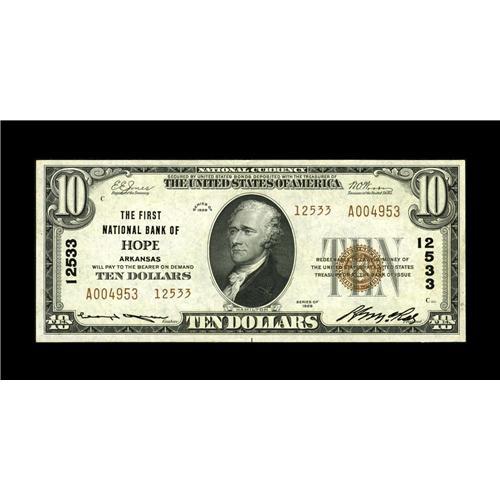<B>Hope, AR</B></I> - $10 1929 Ty. 2 <B>The First NB</B></I> Ch. # 12533<BR>This was the last of three banks chartered here, and the only one to issue Series 1929 notes exclusively. While certainly not rare, high grade pieces are hardly common, with this example one of the two nicest in the census. <B>Choice About Uncirculated.</B></I><BR><BR><b>Shipping:</b> Coin/Currency (<a target="_blank" href="http://www.heritageauctions.com/common/shipping.php">view shipping information</a>)