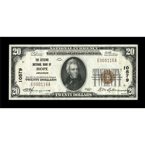 <B>Hope, AR</B></I> - $20 1929 Ty. 1 <B>The Citizens NB</B></I> Ch. # 10579<BR> This pleasingly original example boasts strong embossing and bright white paper. <B>Extremely Fine.</B></I><BR><BR><b>Shipping:</b> Coins & Currency (<a target="_blank" href="http://www.heritageauctions.com/common/shipping.php">view shipping information</a>)