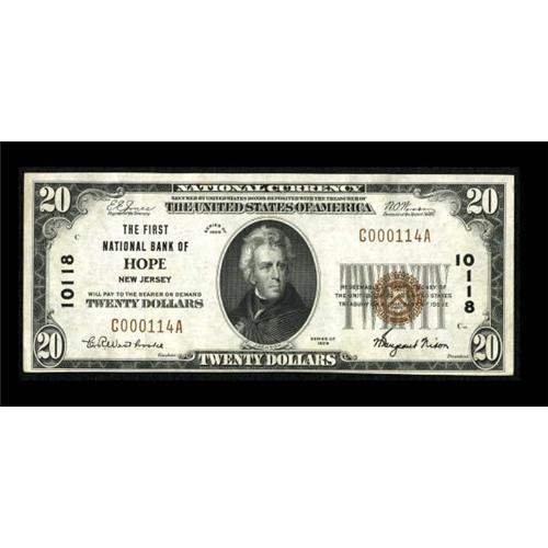 <B>Hope, NJ</B></I> - $20 1929 Ty. 1 <B>The First NB</B></I> Ch. # 10118<BR> This two-fold <B>About Uncirculated </B></I>example is pleasingly original and far and away the finest known small size note known from this one bank town.<BR><BR><b>Shipping:</b> Coins & Currency (<a target="_blank" href="http://www.heritageauctions.com/common/shipping.php">view shipping information</a>)