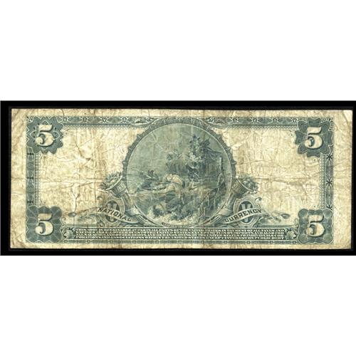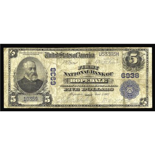 <B>Hopedale, OH</B></I> - $5 1902 Plain Back Fr. 598 <B>The First NB </B></I> Ch. # 6938<BR>A <B>Very Good</B></I> example from the only issuer in this Harrison County locale. The large census from here consists of a single $5 Red Seal and four $5 Plain Backs. The blue stamped signatures remain legible and the note is adequately margined all around. This is quite simply a scarce note worthy of a bid commensurate with its miniscule population.