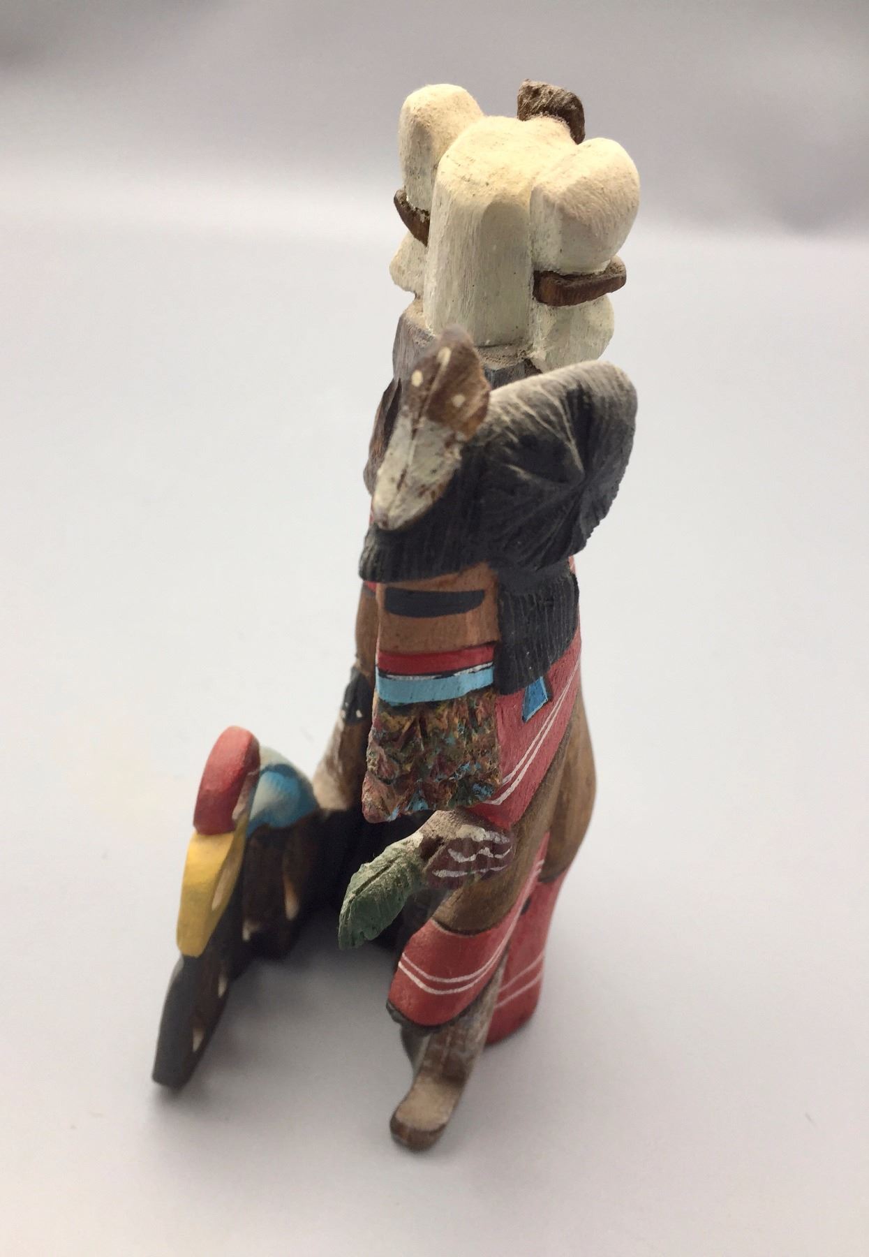 Maker: Signed, but unknown. Approx. Age: Fairly modern. Size: Measures approx. 4” at its widest x 6 1/2” h. Additional Info: Hand carved/painted figure from 3rd Mesa, Bacavi Village. Condition: Good for it’s age, NOS from a dealer who is retiring. Please look closely at the pictures - they are an important part of our description. Shipping: There will be a $7 handling / packaging fee for shipping this lot. The actual cost of postage will be added on top of that.