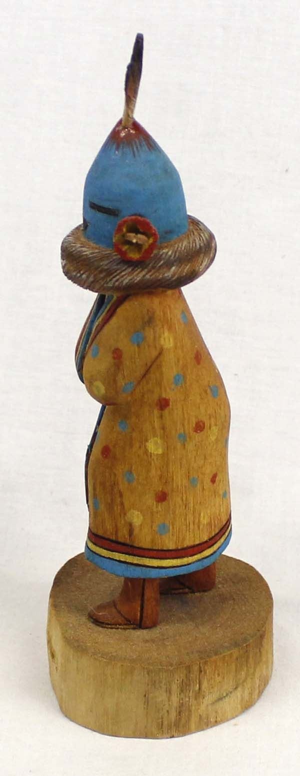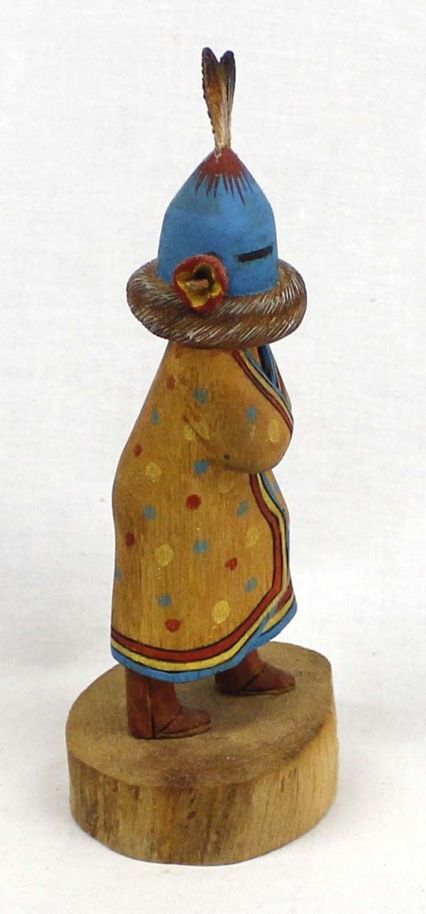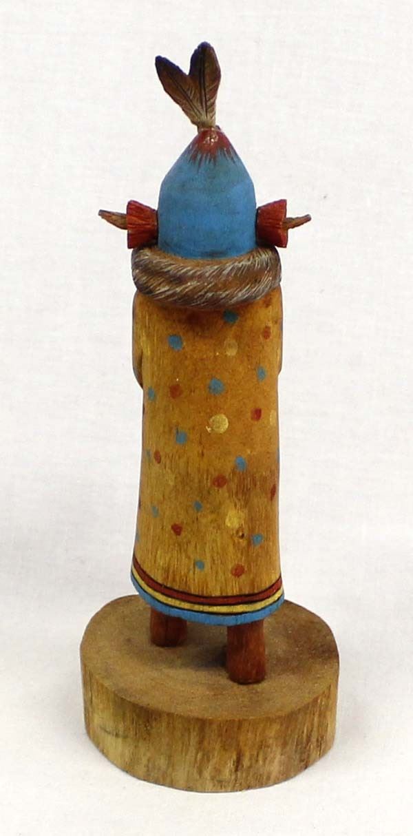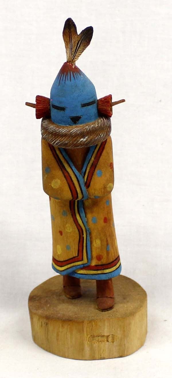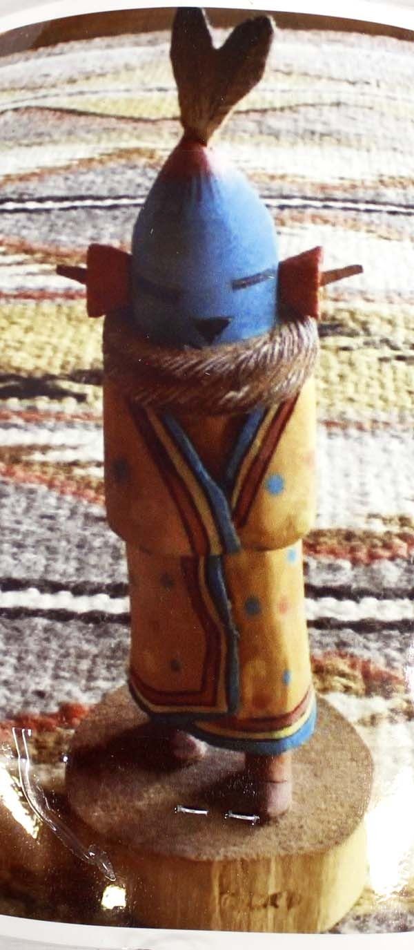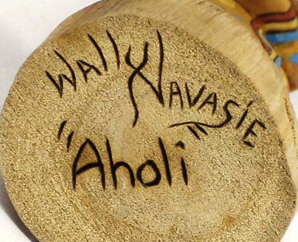 Native American Hopi Aholi Kachina by Wally Navasie, measures 2'' x 6'' x 2'' and is signed on the bottom, topknot feathers have been glued back on, beautifully hand carved, painted, and wood burned, FYI: ''Wally Navasie is a talented carver from First Mesa. He has been carving most of his life and is well known for his Butterfly Maidens and other sculptural pieces.”