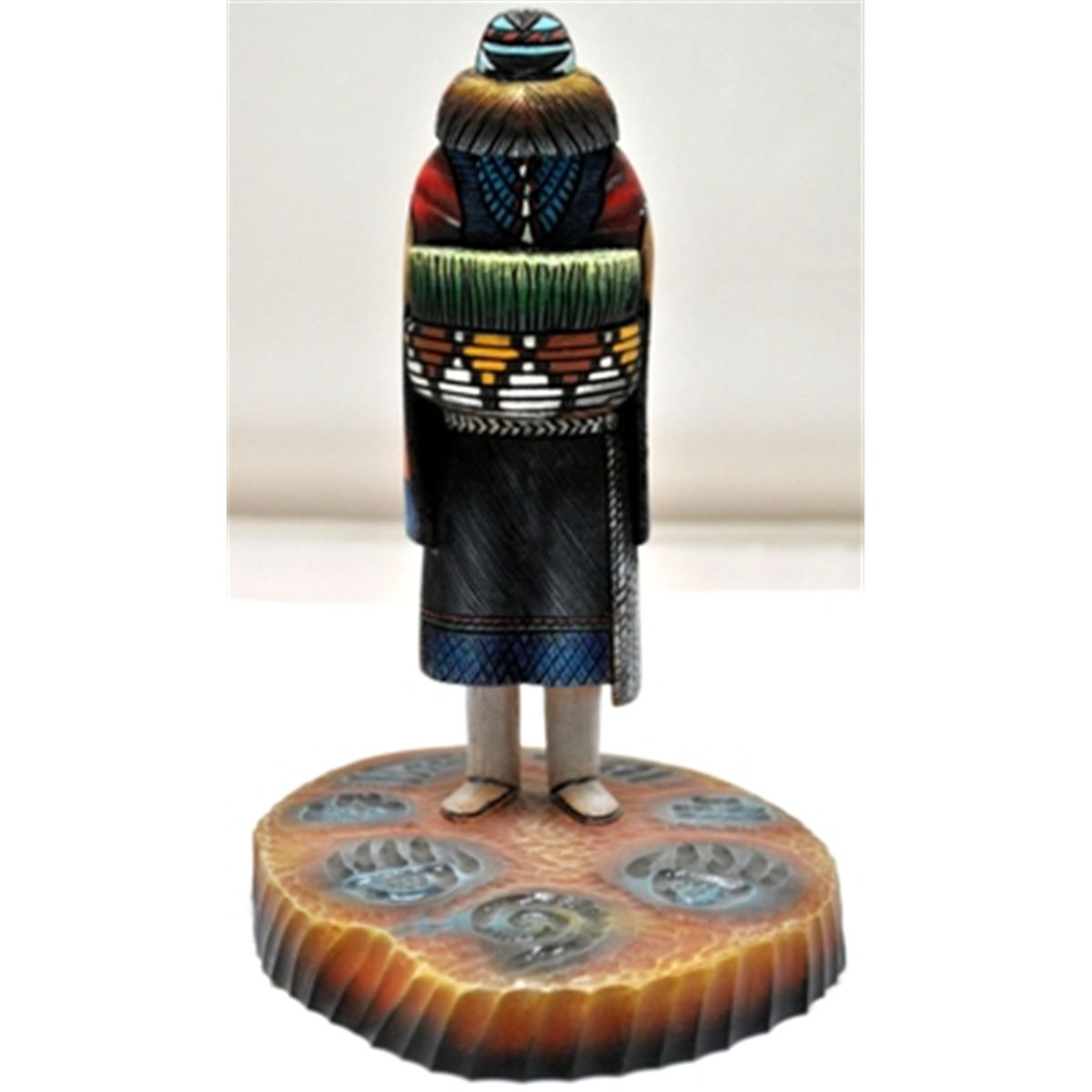 Measures 6.25" tall by 4" wide by 5" deep. Figure included is "Angwusnasomtaqa" (Crow Mother). This is a rare piece by artist Sterling. One of a kind, the entire piece is carved out of a single piece of cottonwood.