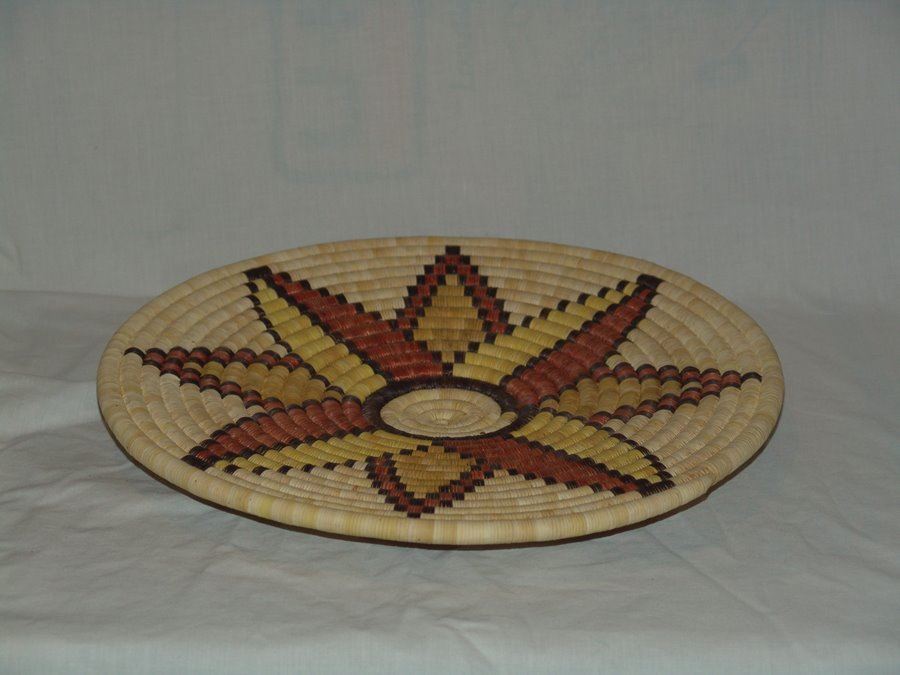 Large classic 2nd Mesa coiled plaque with traditional four-way polychrome squash blossom design. Very good condition.,Ca. 1980s,16"