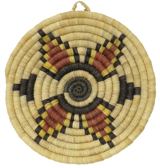 Late 1900s, Tightly woven 2nd Mesa coiled plaque or tray with 3-color squash blossom design; excellent condition. 8-1/2" dia.