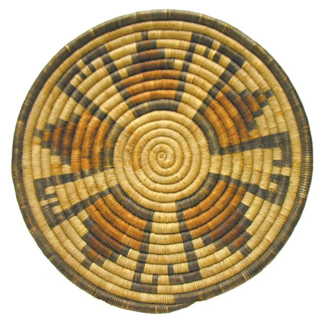 Early 1900s, Coiled 2nd Mesa polychrome basket with hooked pyramid motif. 3" x 5"