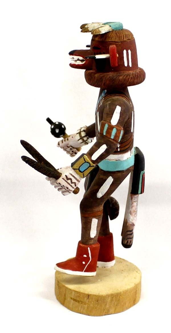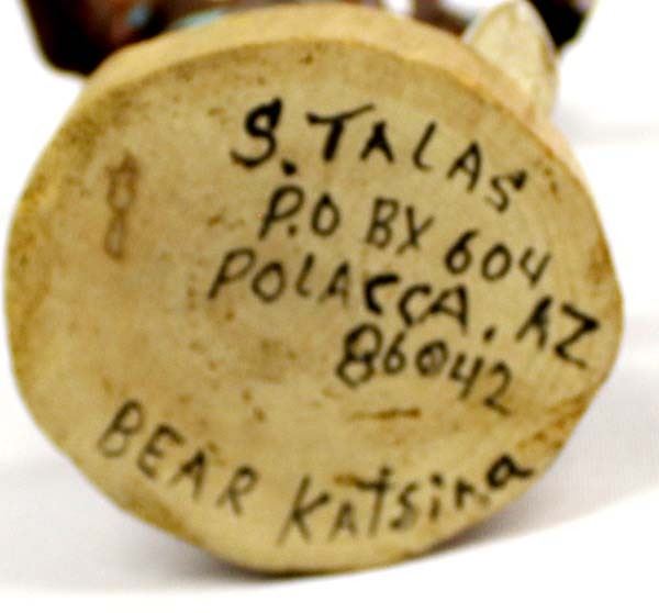 Native American Hopi Bear Katsina by Sheldon Talas of Polacca-Arizona (b. 1940's), measures 8.5'' x 4.5'' x 3'' and is signed on the bottom, ''FYI: Hopi Kachina Carver Sheldon Talas was born around 1940 and lives at Polacca, at the base of First Mesa. He has been an award winner at the annual Hopi Show at the Museum of Northern Arizona in Flagstaff for his amazing Kachina - Katsina carvings.''