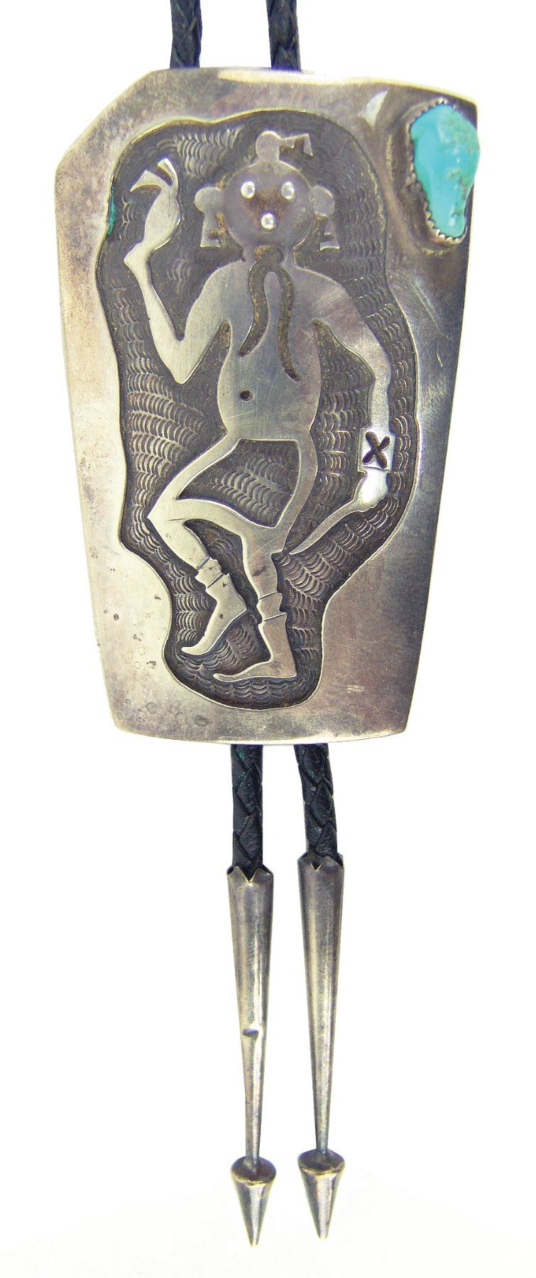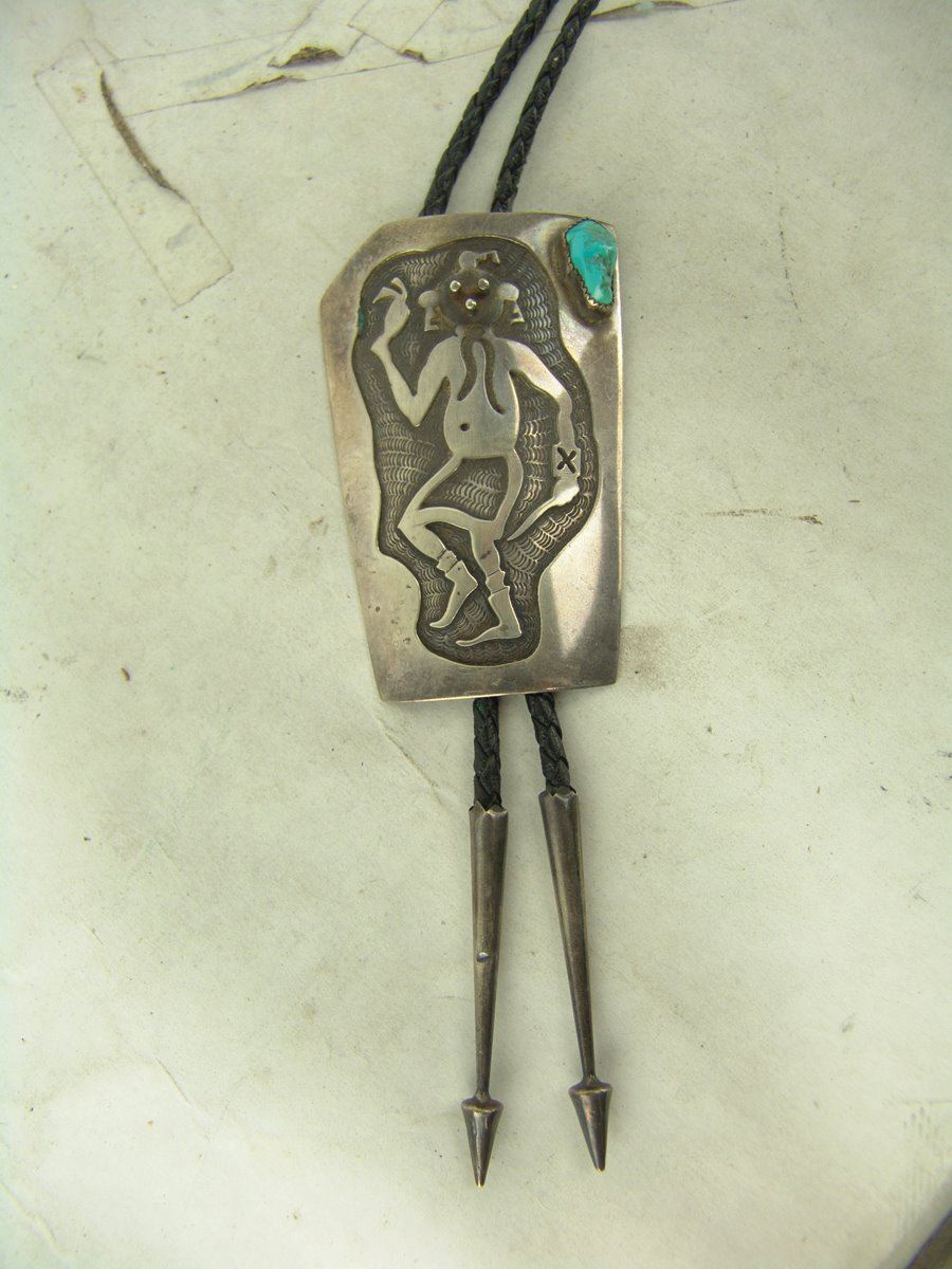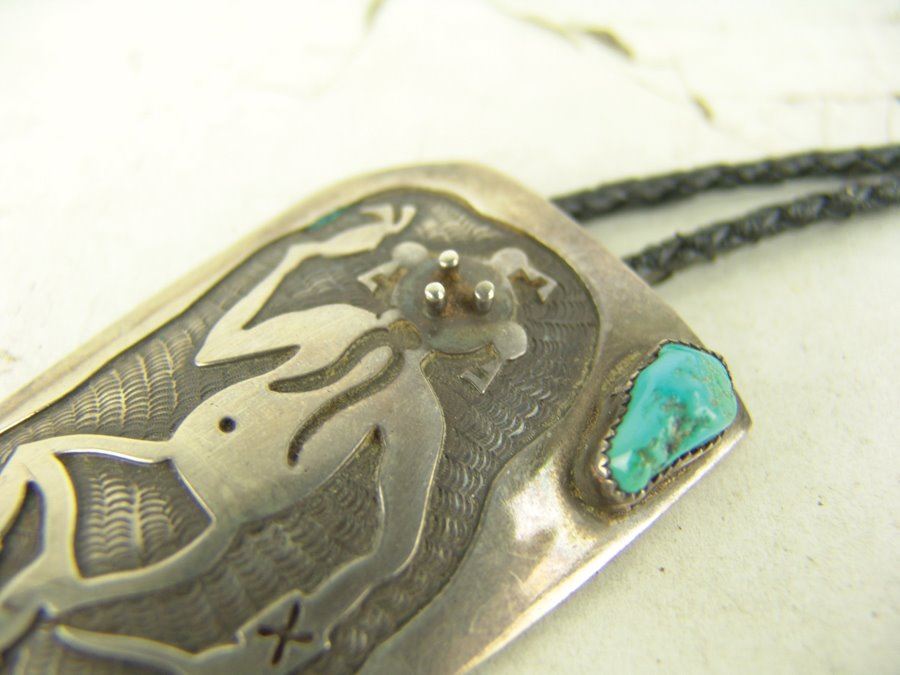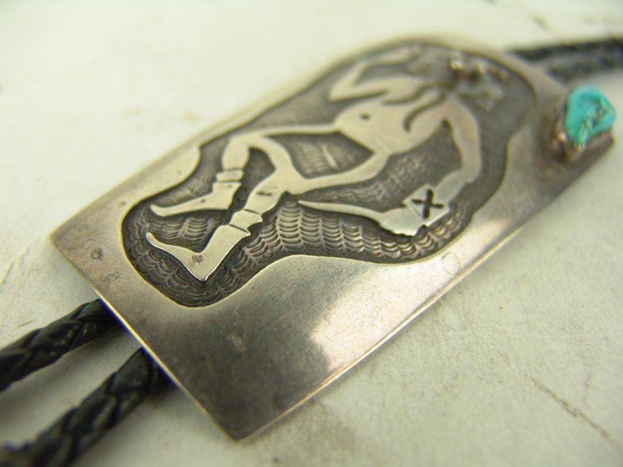 Early silver-on-silver overlay bolo featuring a mudhead dancer in action, a single turquoise stone, and custom tips. Very good condition, with his early hallmark.,,3-1/2" x 2-1/8"