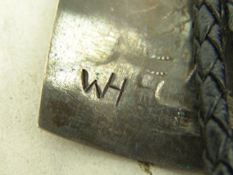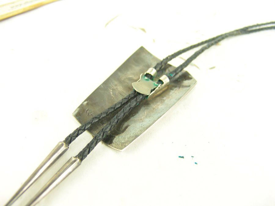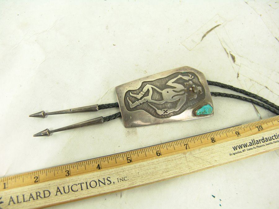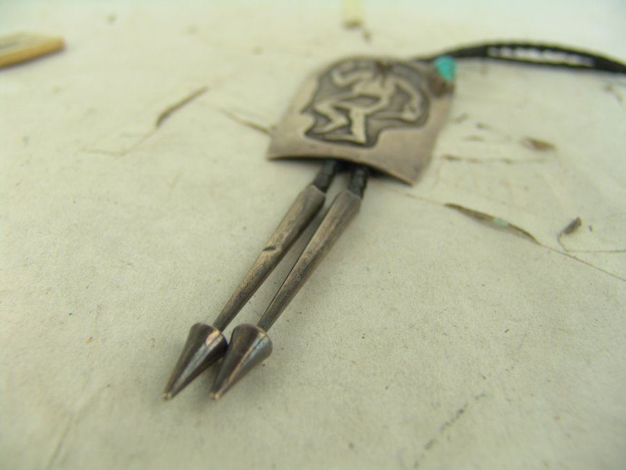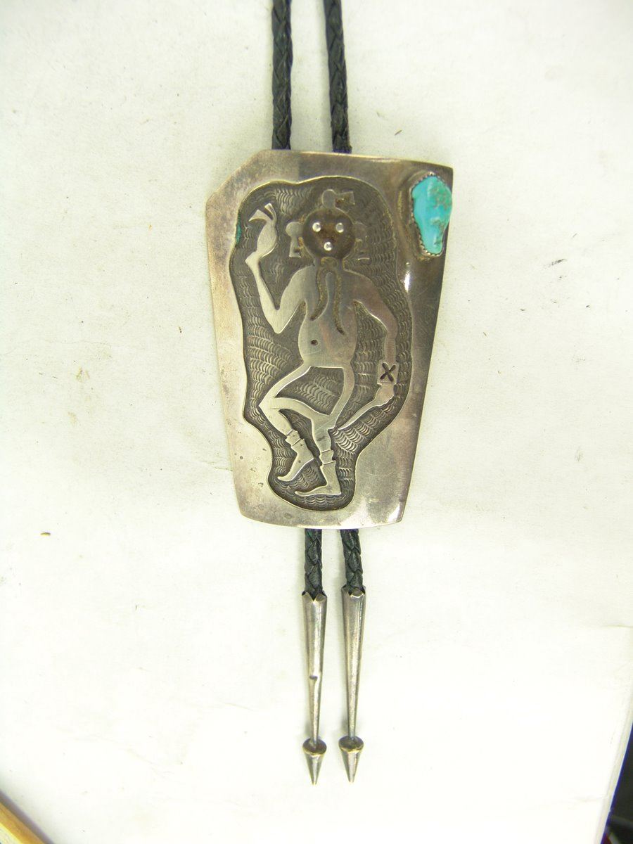 Early silver-on-silver overlay bolo featuring a mudhead dancer in action, a single turquoise stone, and custom tips. Very good condition, with his early hallmark.,,3-1/2" x 2-1/8"