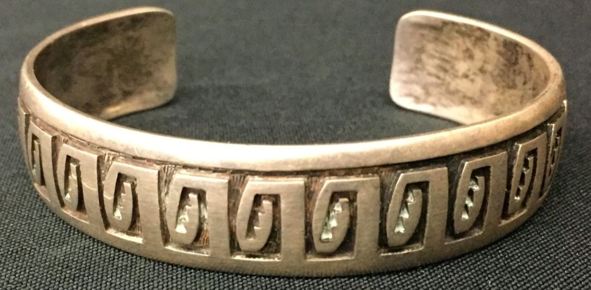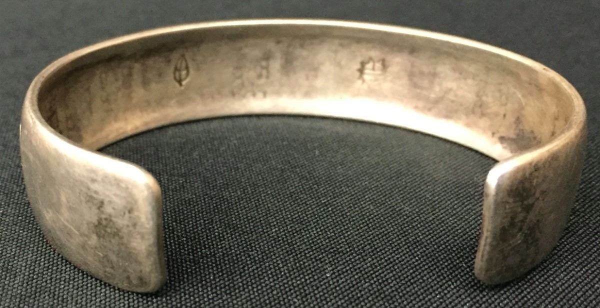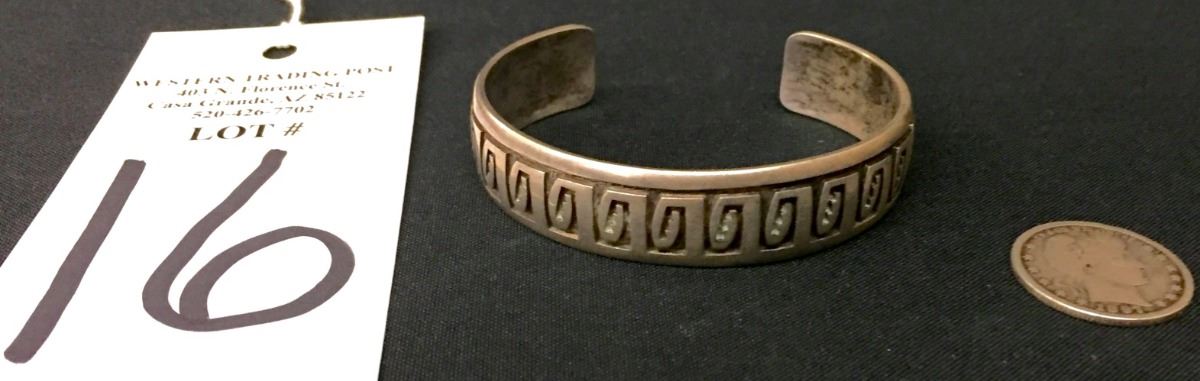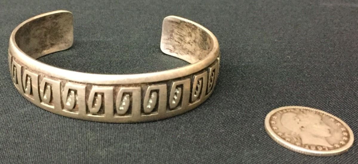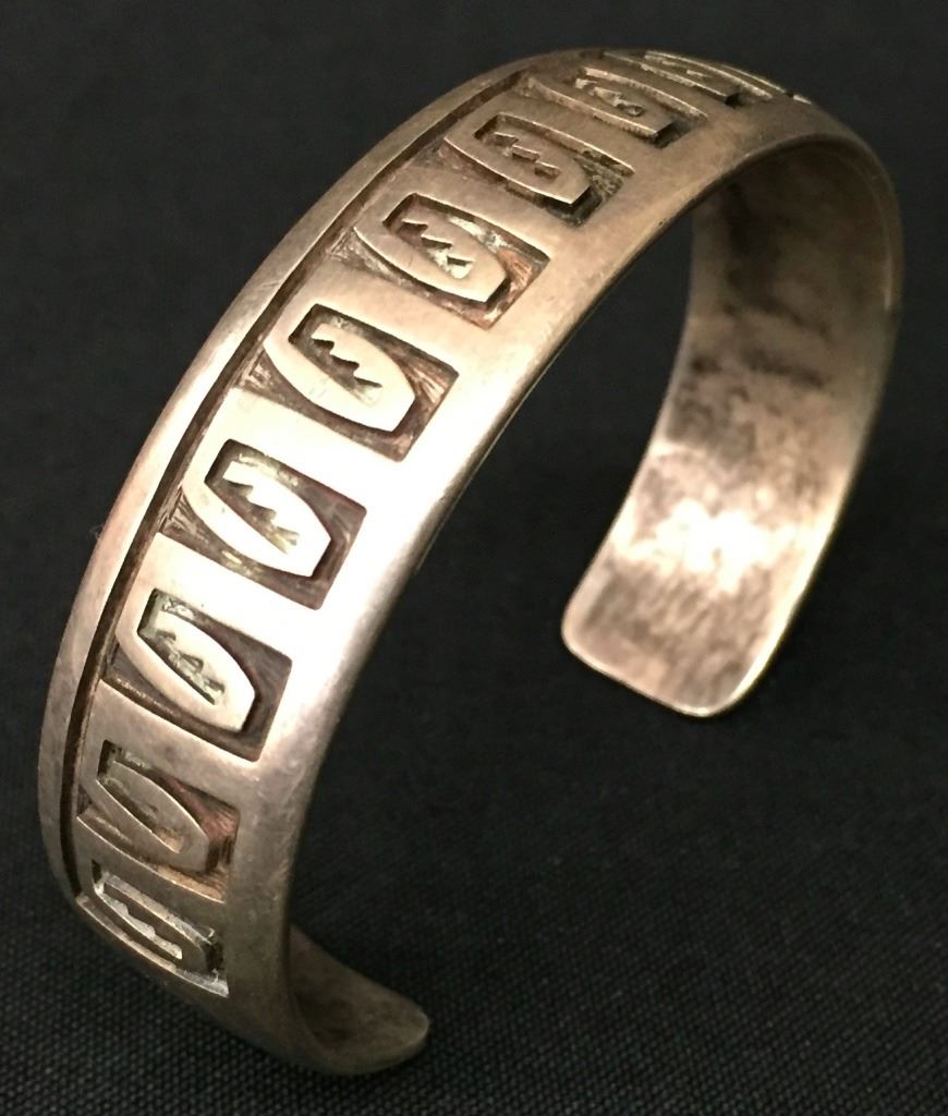 This cuff bracelet measures approximately 6” inside plus there is a 1.25” opening. It is just over .5” wide and weighs 32.5 g. Sterling silver and signed. Good condition. Please look closely at the pics as they are an important part of our description. Shipping: There will be a $5 handling / packaging fee for shipping this lot. The actual cost of postage will be added on top of that.