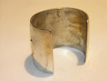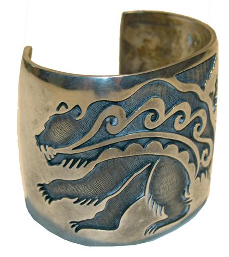 Circa Late 1900s, Marvelous Hopi heavy sterling cuff with overlay depicting a bear. 5-3/4" x 2-1/4" + 1-1/4" gap