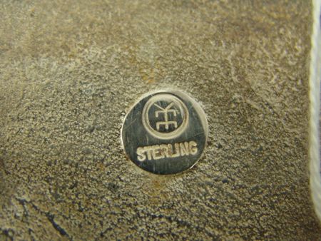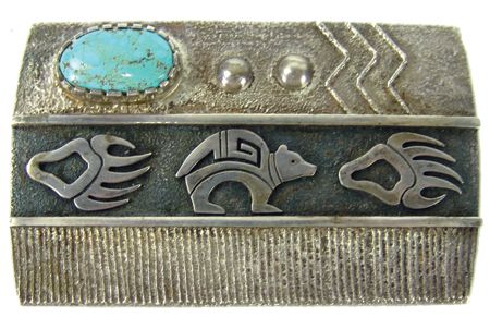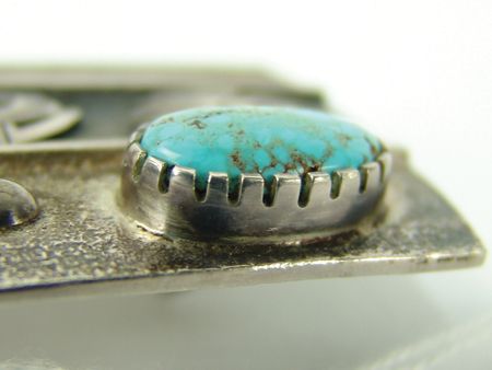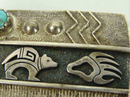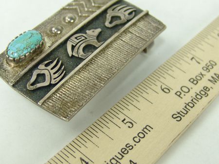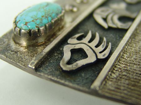 Late 1900s, Beautiful original design tufa cast all-silver belt buckle with textured edges, overlaid bear and claw symbols, and a single oval turquoise stone. Very good condition. 1-3/4" x 3"