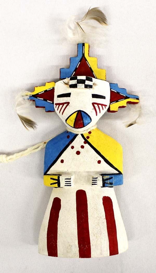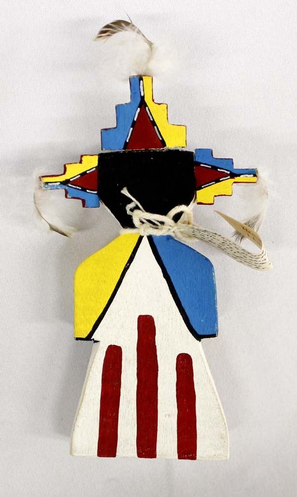 Vintage Native American Hopi Butterfly Maiden Cradle Board Kachina by Harmon Kay, measures 4'' x 6.5'' and is embellished with feathers, the old card attached to the kachina reads ''Polik-Mana Butterfly Maiden These are partners for the ''Butterfly Kachina Poli Male This doll given to Hopi babies during their third year.''