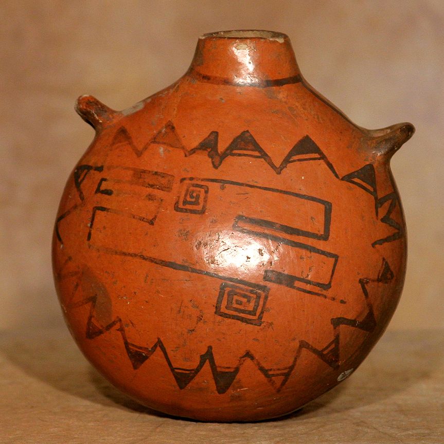 Hopi Canteen. 6 ½" x 6" x 4". Black on red designs. Early 1900s. (est. $600-800). CONDITION REPORTS: www.auctioninsantafe.com/docs/cr2012.pdf