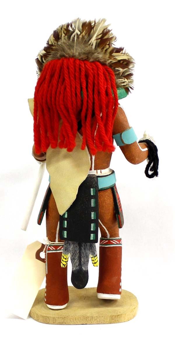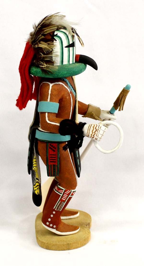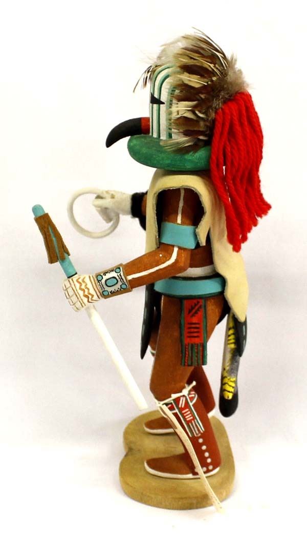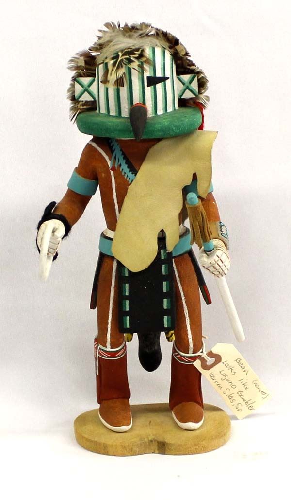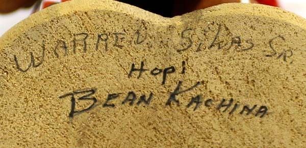 Native American Hopi Carved Wood ''Bean'' Kachina by Warren Silas, Sr., measures 4.5''W x 10''H and is signed on the bottom, beautifully carved and hand painted, embellished with feathers, leather, and yarn, well executed with intricate details