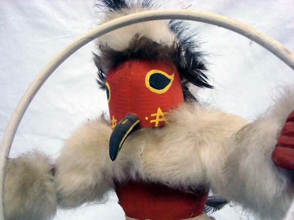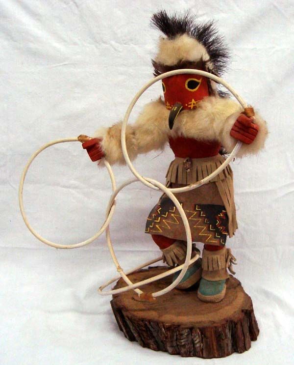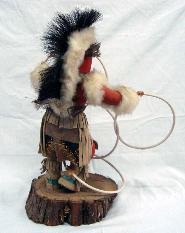 Native American Hopi Carved Wood Kachina Hoop Dancer. Large Kachina has fur and leather trim. He balances four wooden hoops and stands on a large wood base. He measures 16.5''Hx12.5''W.
