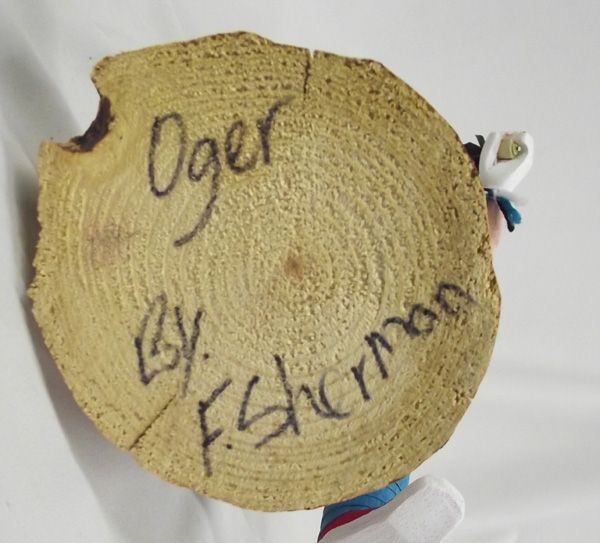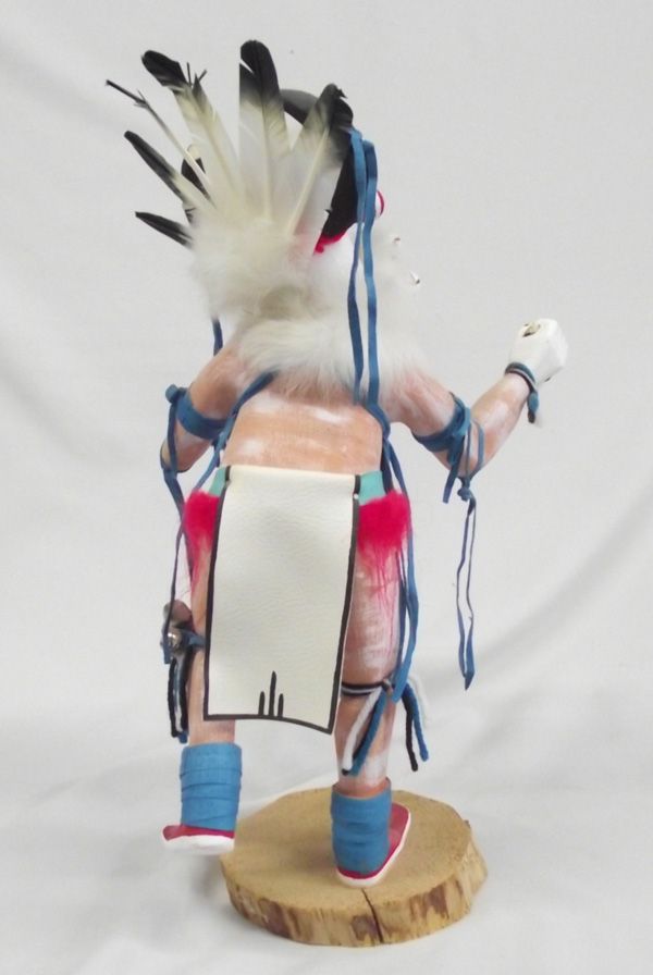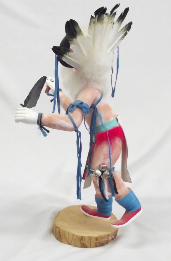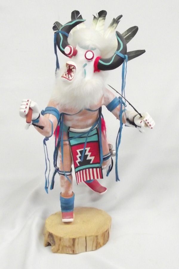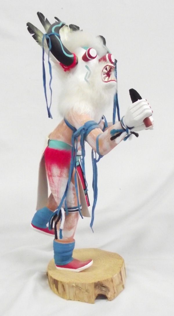 Native American Hopi Carved Wood Ogre Kachina - F Sherman. Big, imposing ogre Kachina has a feather in left hand and a missing object in the right hand. His teeth and horns are meant to scare, which is consistent with the ''Ogre'' Kachina's purpose - to impose discipline. This one has a feather headdress and fur and leather trim. He is 14''H x 7.5''W.