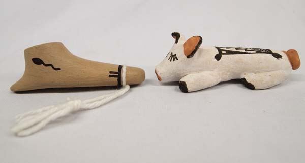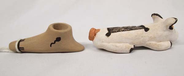 Native American Hopi Clay Pipe with Tadpole Designs and Acoma Pottery Pig by I. Castillo and is signed on bottom, pig measures 3.5''L x 1.5''H x 1.5''W