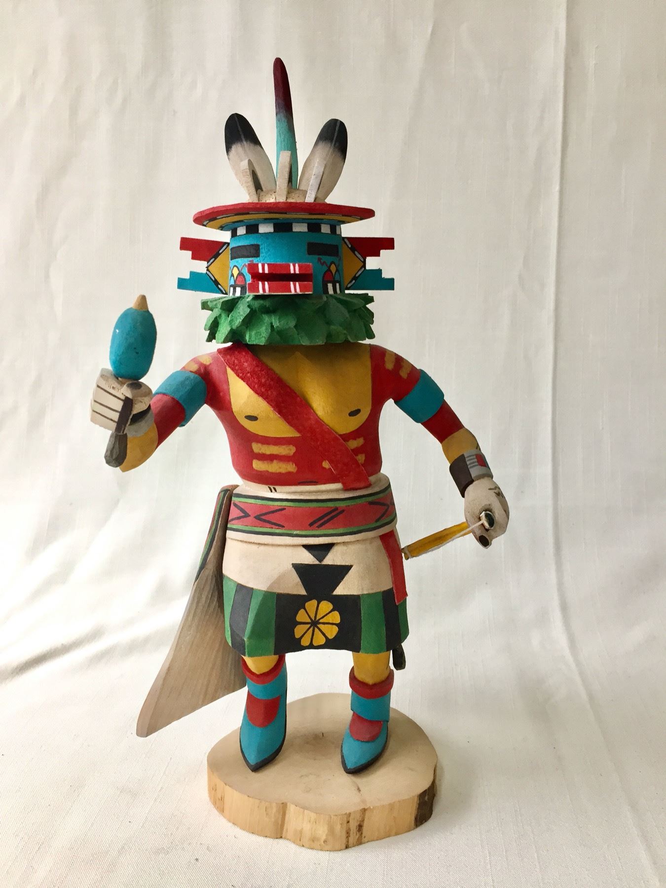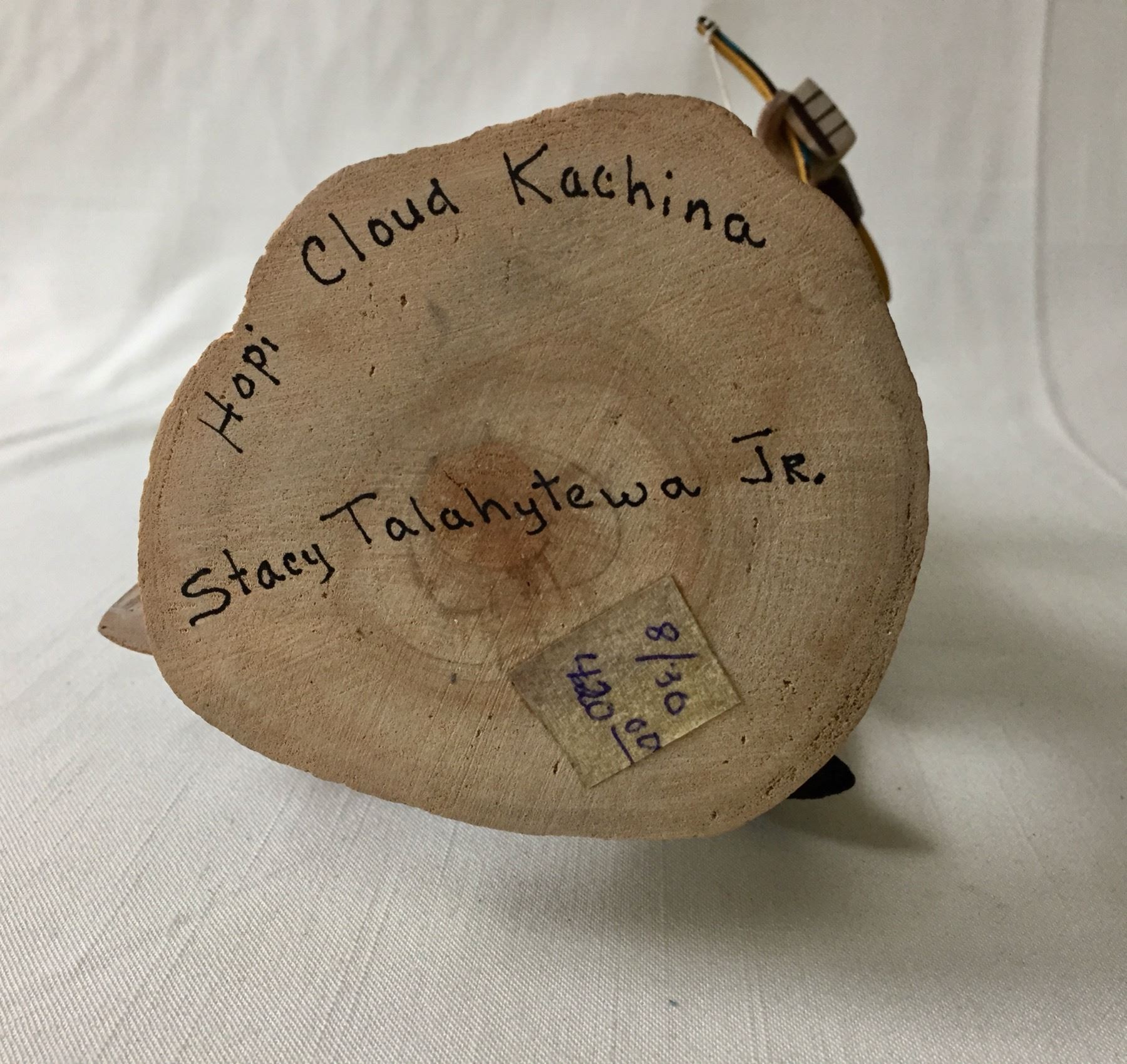 Description: Presented for sale in this lot is this gorgeous Cloud Kachina. This is a hand crafted and brightly painted Hopi Kachina. Maker: Stacy Talahytewa, Hopi. Approx. Age: Fairly modern. Size: 13 inches tall x 6-1/2 inches wide. Condition: Good for its age, normal wear expected. Please look closely at the pictures - they are an important part of our description. Shipping: There will be a $8 handling, packaging fee for shipping this lot. The actual cost of postage will be added on top of that.