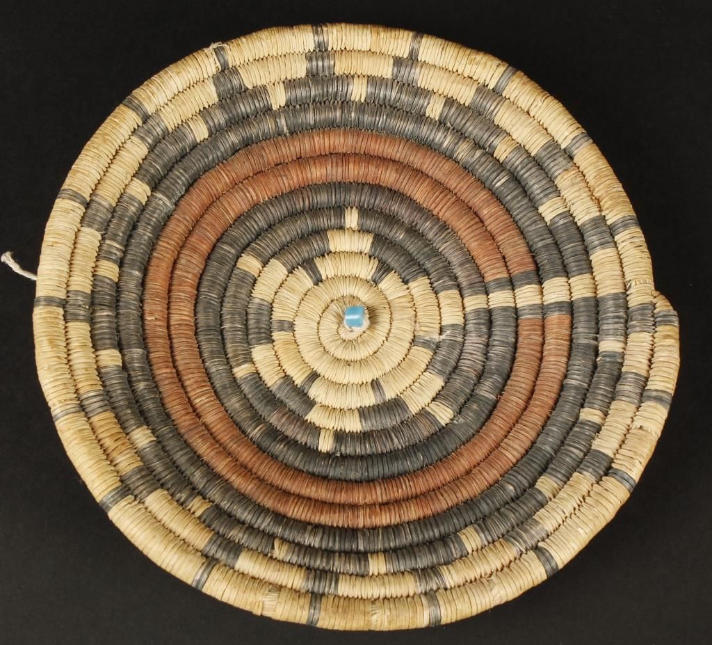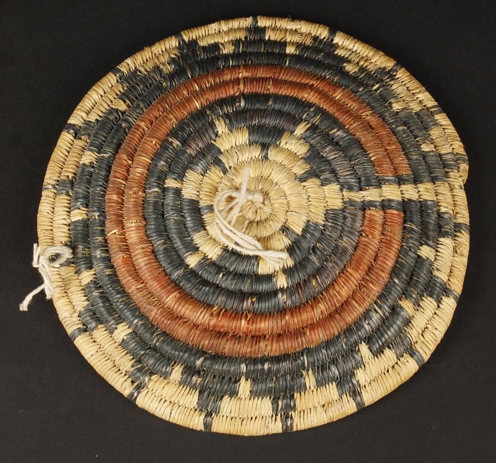 Circa 1940's. With red and black sun design. Color has started to fade with minor scattered losses to weaving. 7-1/4" diameter.