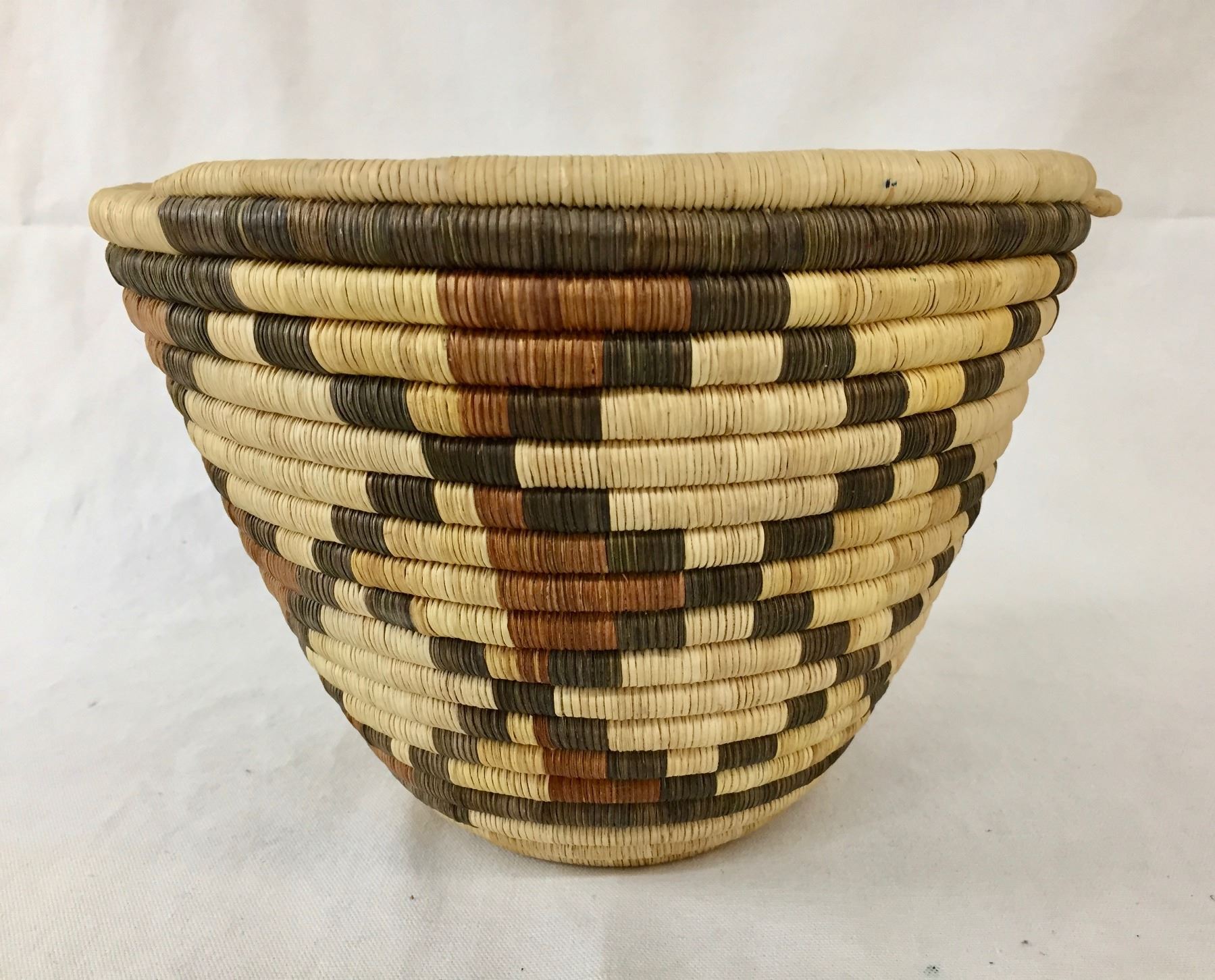 Description: Presented for sale in this lot is a coiled basket. Coiled basketry of this type is made on the Second Mesa villages on the Hopi Reservation. Each stitch of a coil is interlocked into the adjoining stitch of the previous coil. You can image the time it would have taken to create such a beautiful basket. Maker: Unknown Hopi basket weaver. Approx. Age: Mid 1900s. Size: Measures 9-3/4”w x 7” tall. Condition: Pretty good for its age, wear and fading expected. Please look closely at the pictures - they are an important part of our description. Shipping: There will be a $7 handling / packaging fee for shipping this lot. The actual cost of postage will be added on top of that.