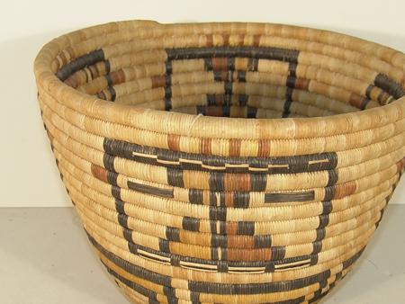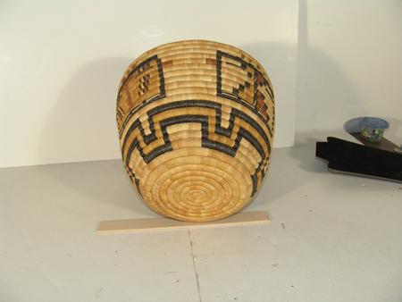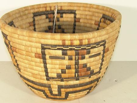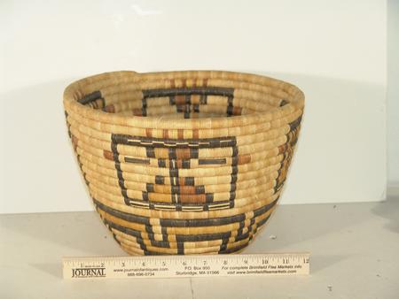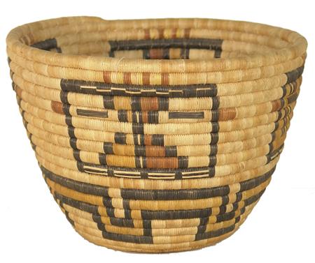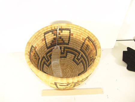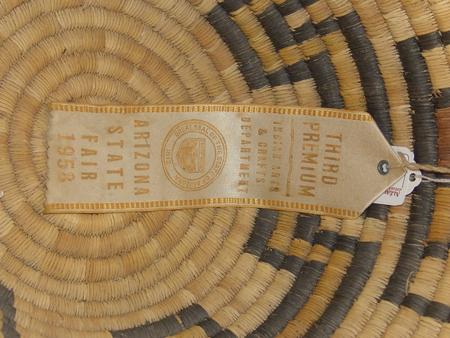 Finely coiled basket with four katsina faces with a three row geometric band on the bottom. Accompanying award ribbon. 9" x 12"