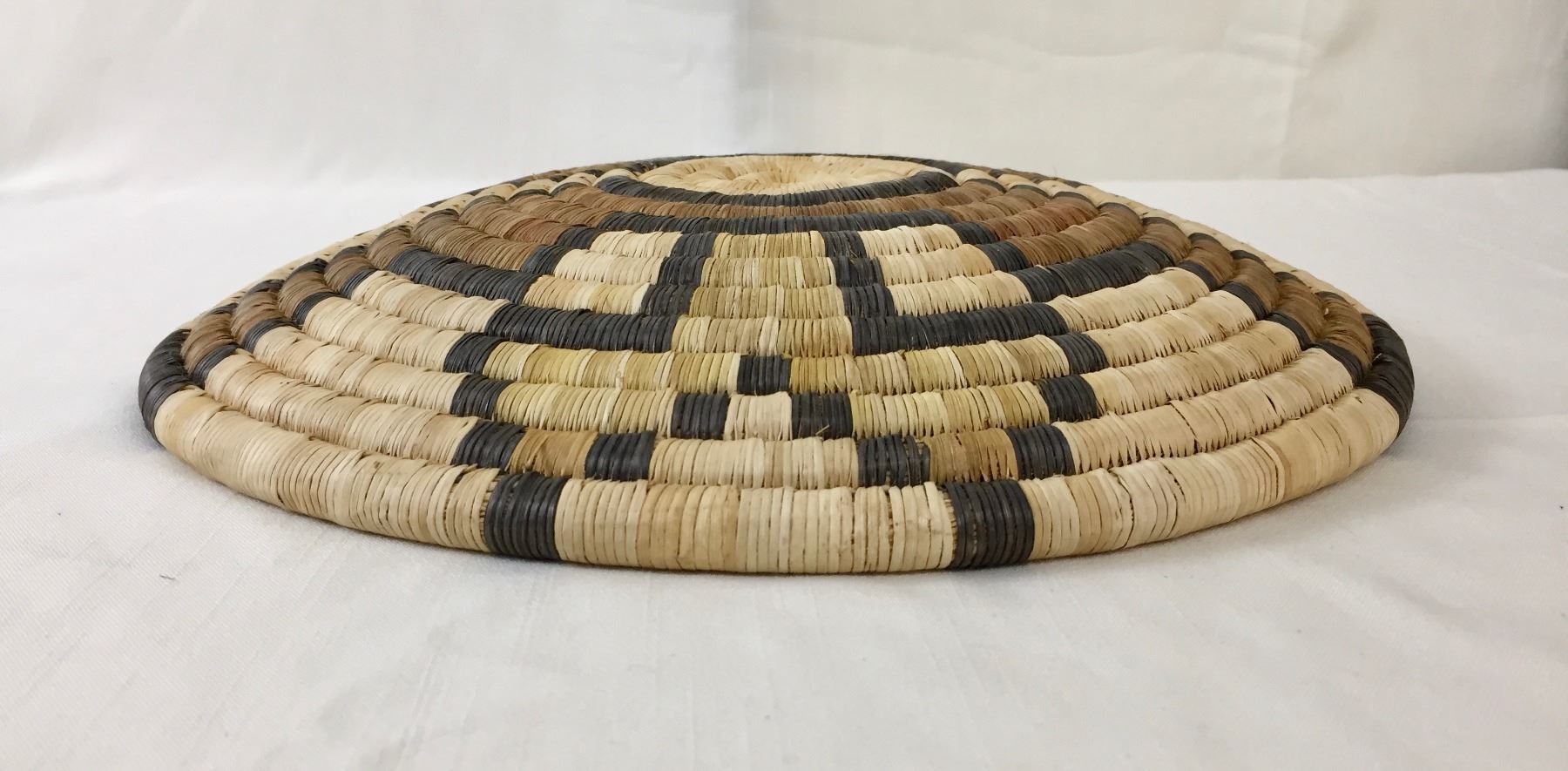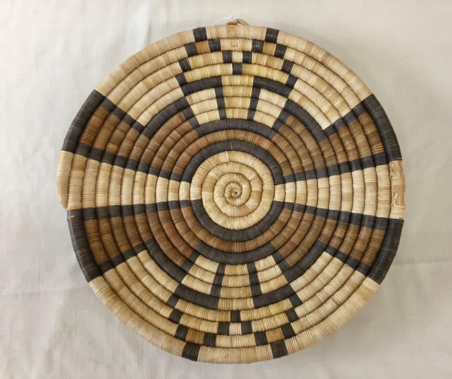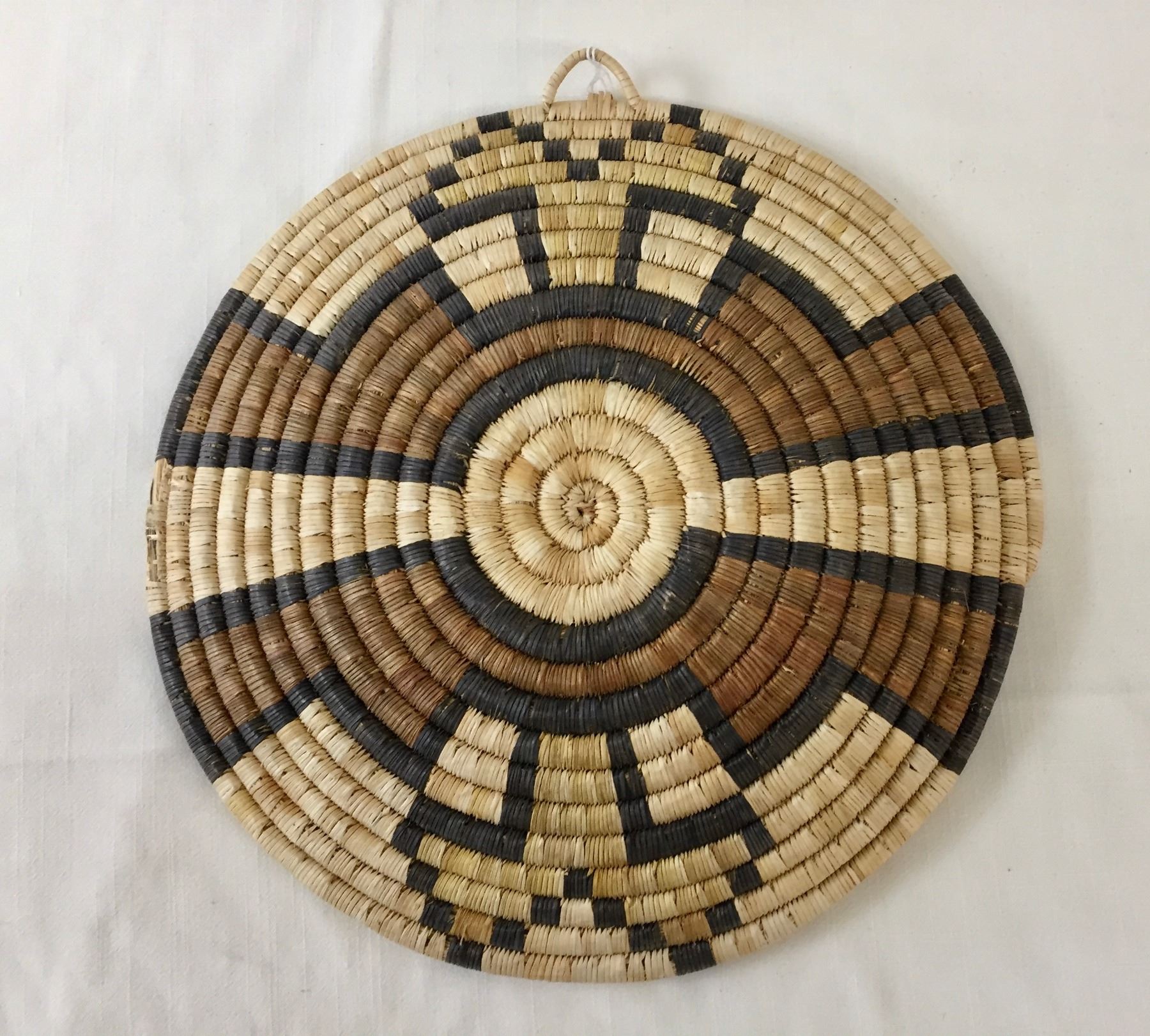 Description: For sale in this lot is a vintage Hopi coiled plaque (basket) featuring browns, tans and blacks. Maker: Unknown Hopi Weaver.