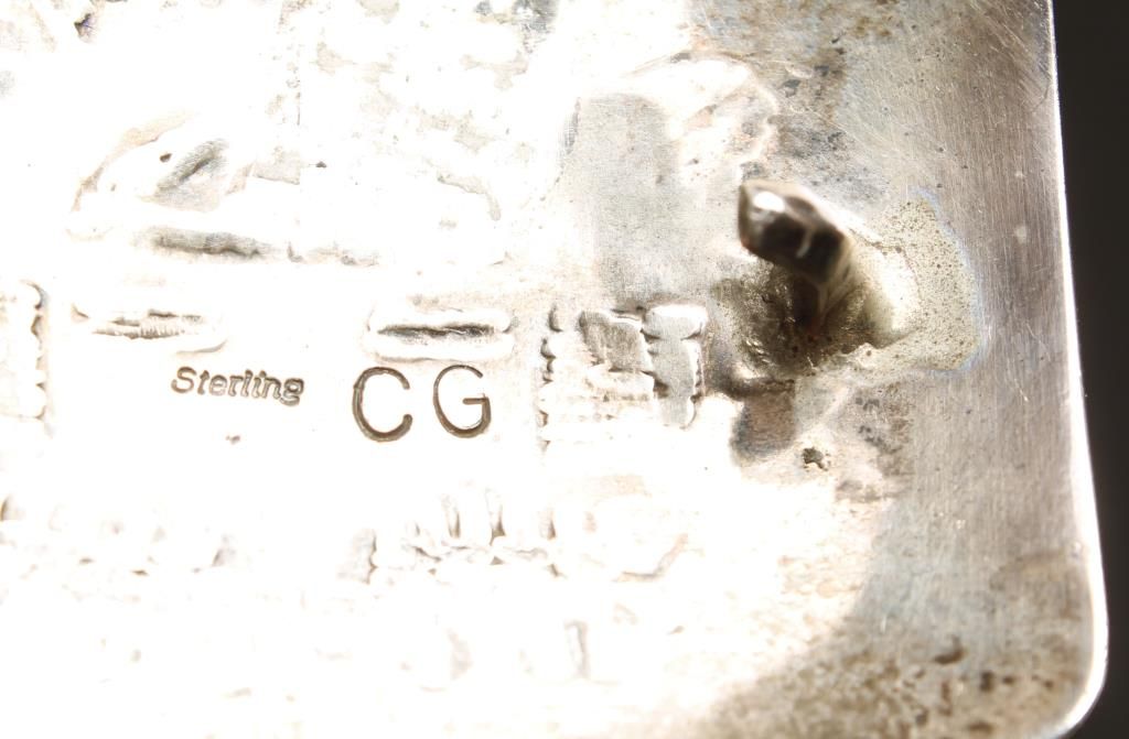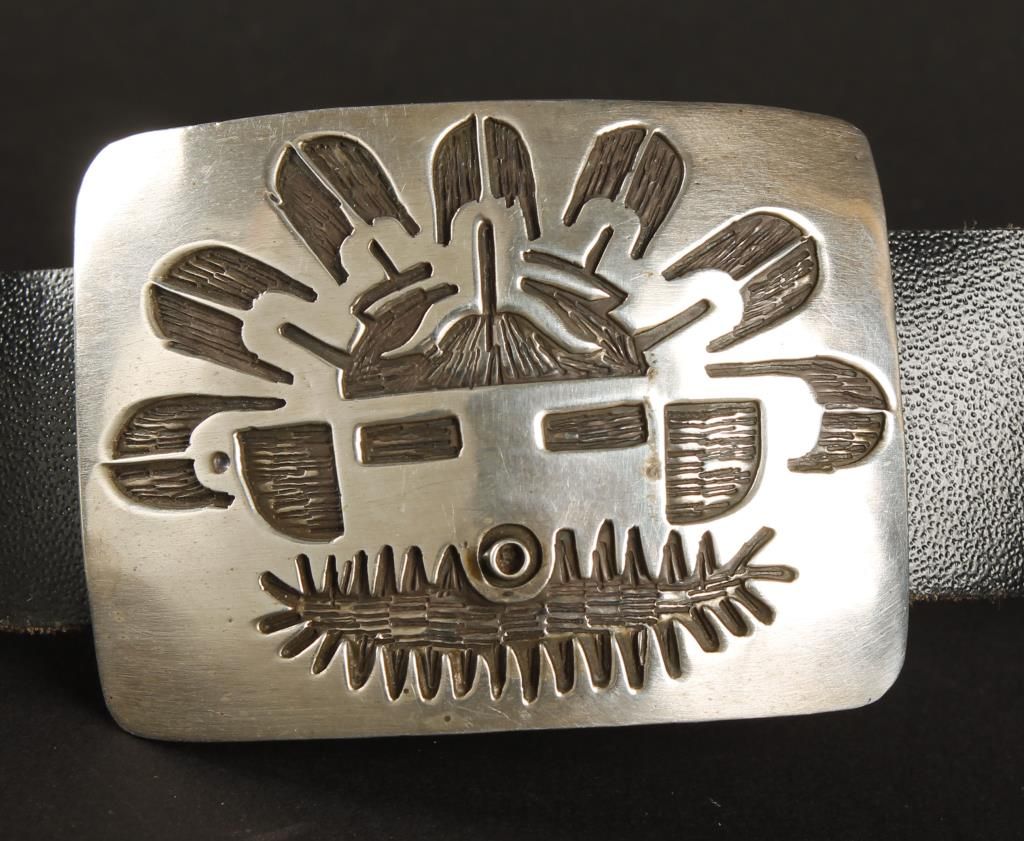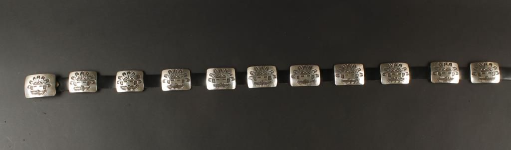 with engraved Kachinas on rectangular conchos all sterling, 11 conchos, stamped "CG", on black leather belt.