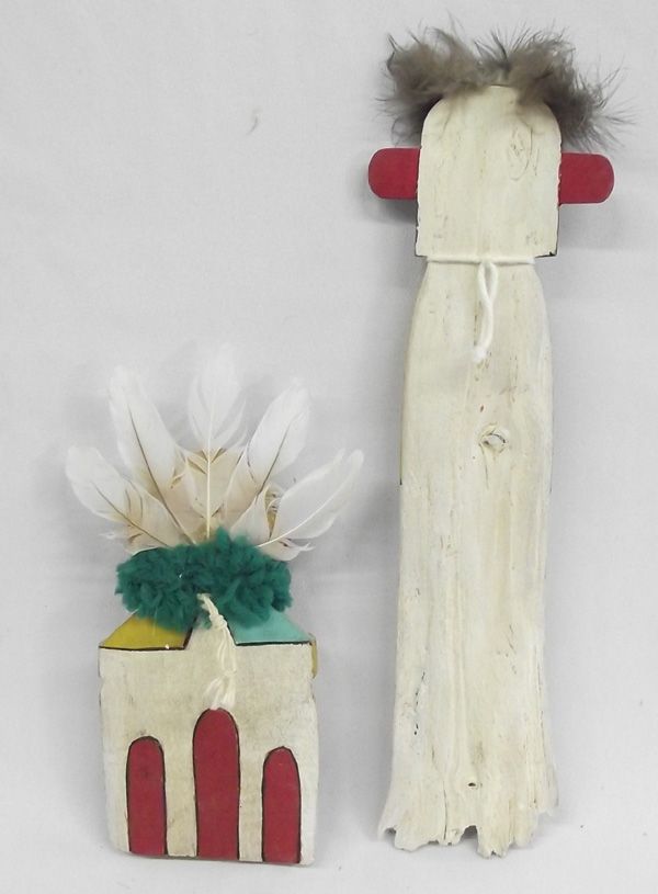 2 Hopi Cradle Board Kachina Dolls. These are hand painted wood kachina dolls, used to entertain the babies and teach them. They are traditional red, white, turquoise, green and yellow and decorated with feathers and yarn trim. The tallest one measures 11''Hx3''W.