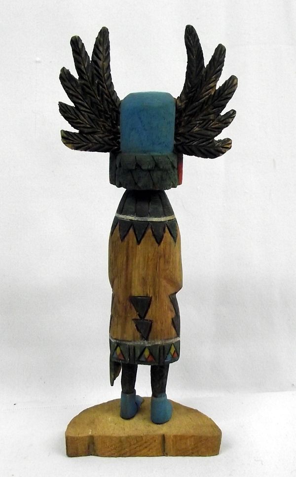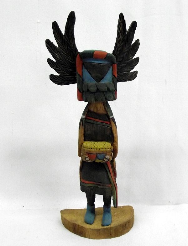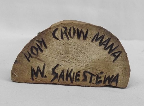 Hopi Crow Man Kachina by M. Sakiestewa, measures approx. 8''H x 3.5''W. Like new condition, Mike Sakiestewa, a Native Hopi from the village of Moenkopi, Az. He now lives in Laguna Pueblo, NM. He has been carving Kachina's for over 18 years. Hopi Kachina's are made from the root of cottonwood tree's. Mike will go out four wheeling to collect his wood from the banks of the Rio Puerco River east of Laguna. Mike's style of carving is unique as he loves to add weapons, tools and other objects to his "subjects".