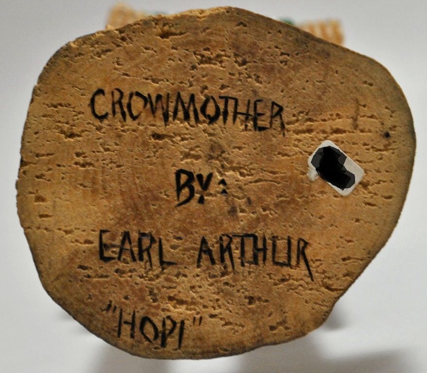 Measures 12" tall by 4-1/2" wide by 4" deep. Figure is Crowmother carved by Hopi artist Earl Arthur. One of a kind, the entire piece is carved from a single piece of cottonwood. Comes with a card of authenticity signed by the artist, not pictured.