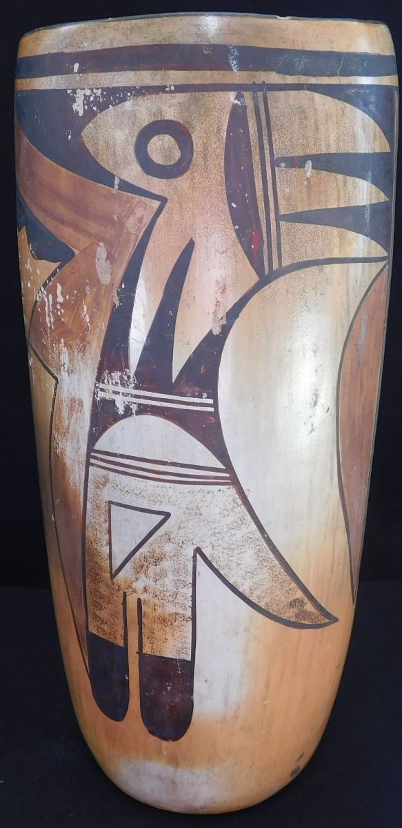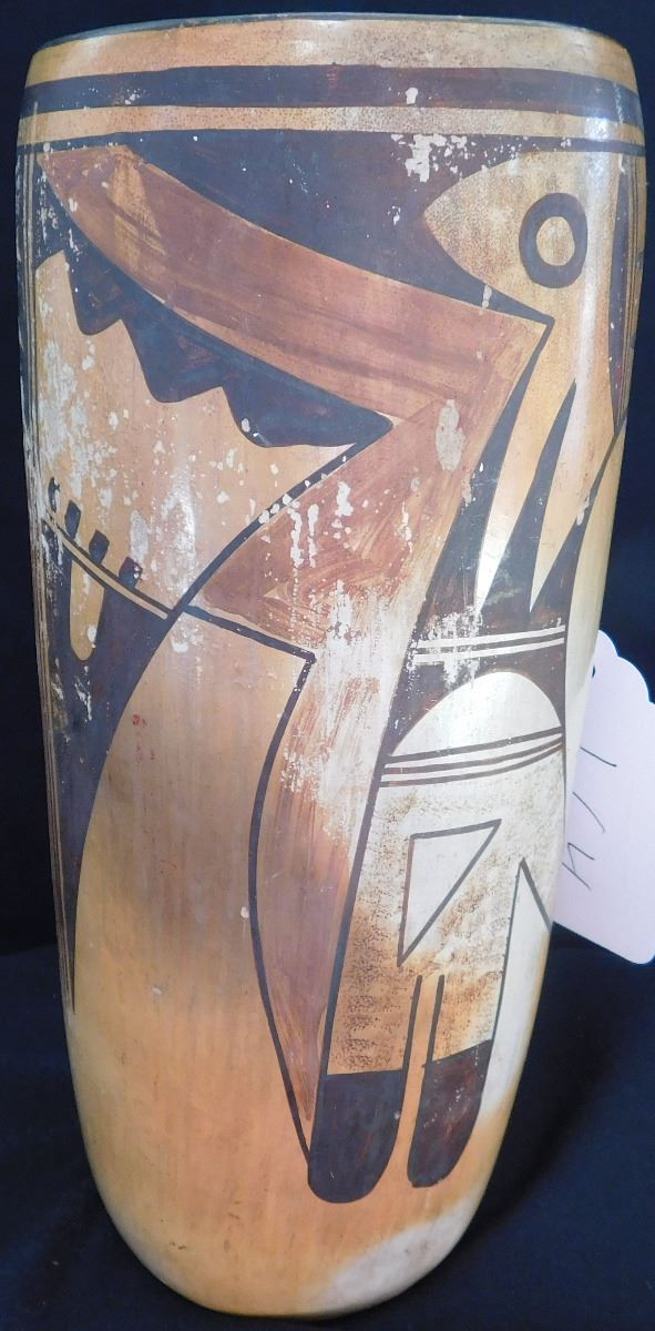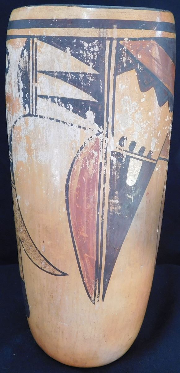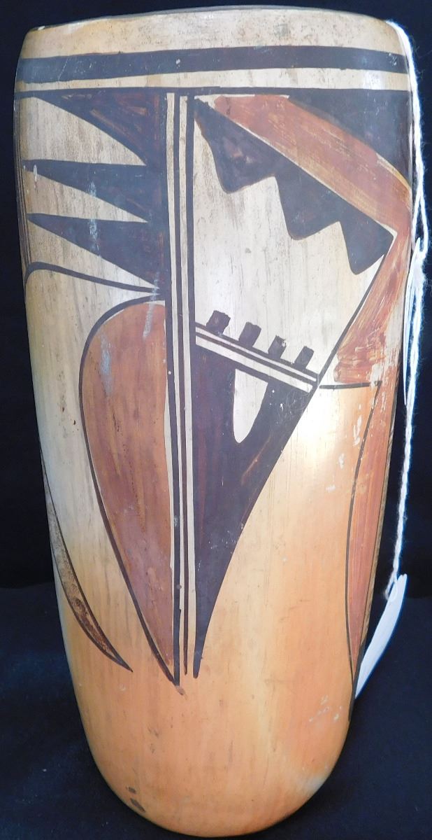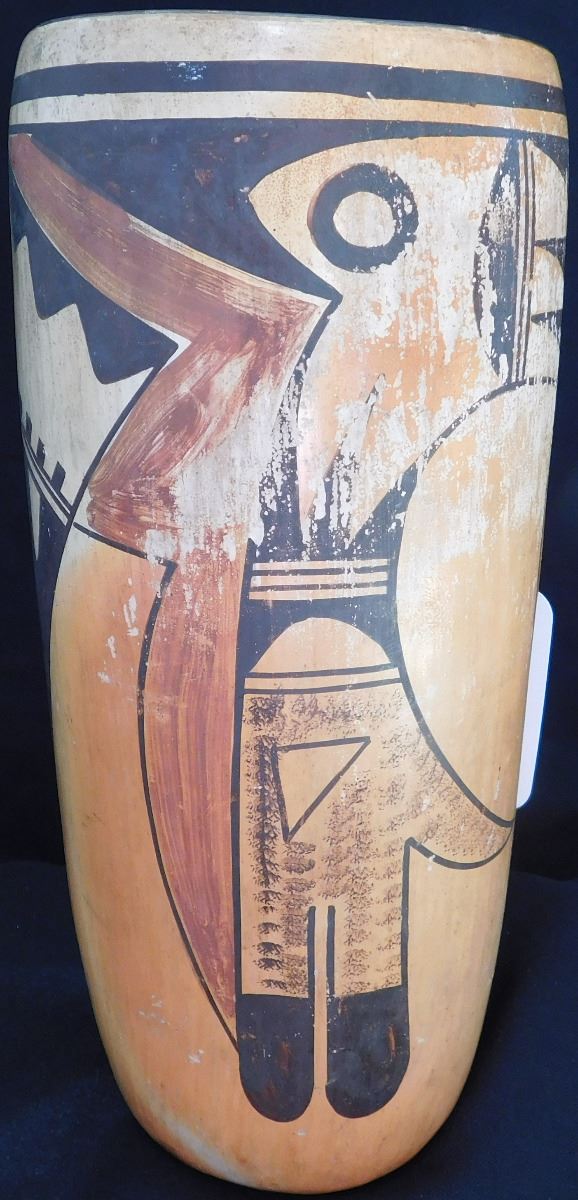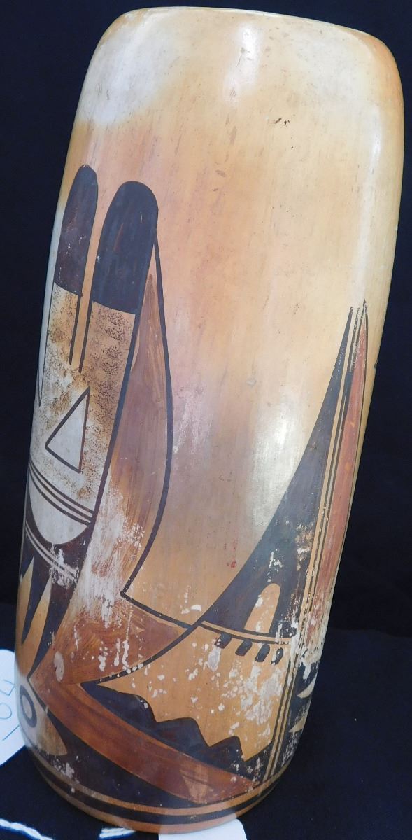 Hopi Cylinder Jar from the 1940's This clay and paint item measures 9.5 x 4 x 4 inches. There are scuffs and scratches, some paint loss. See images. Shipping: $24.00