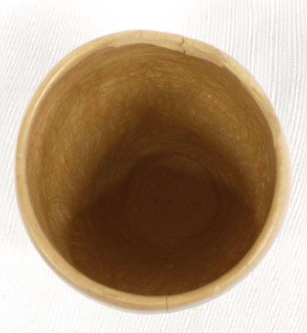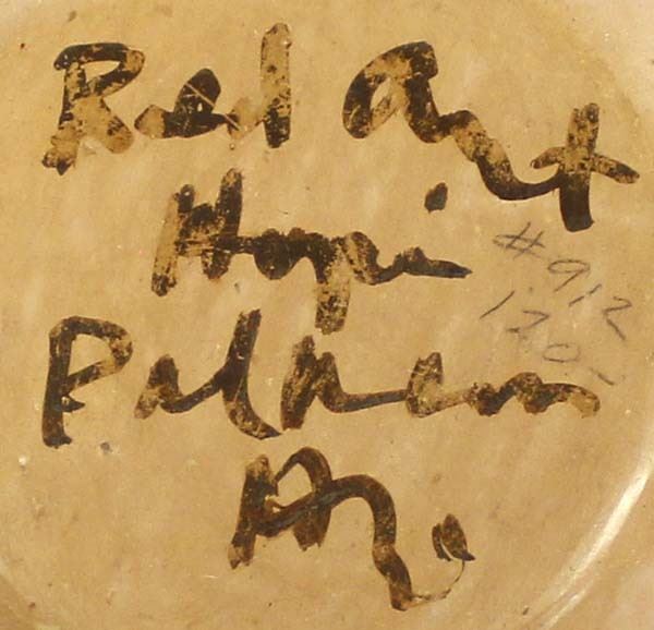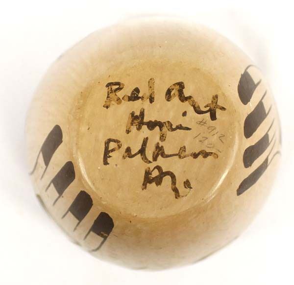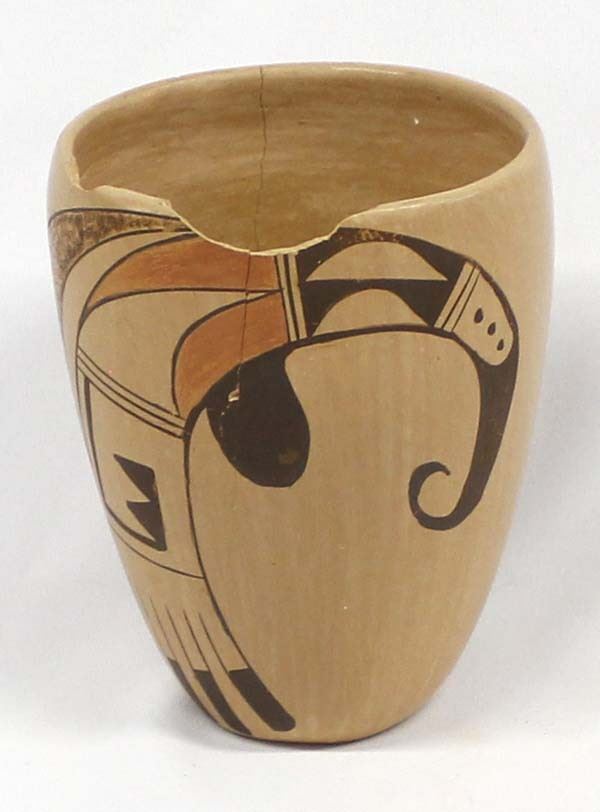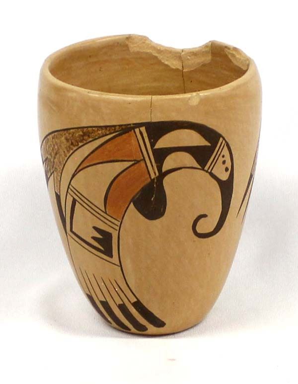 Native American Hopi Cylindrical Pottery Jar by Red Ant, measures 4.25'' x 5.5'' and is signed on the bottom, 3 chips in the rim (small, medium, and large), Sikyatki designs