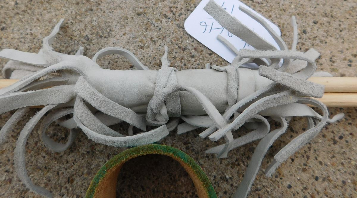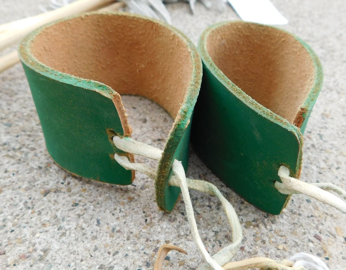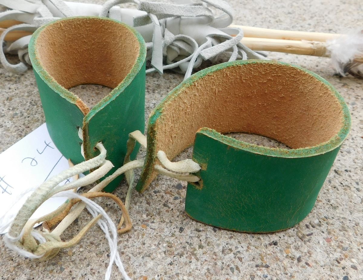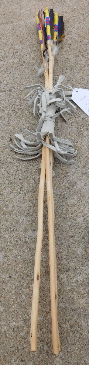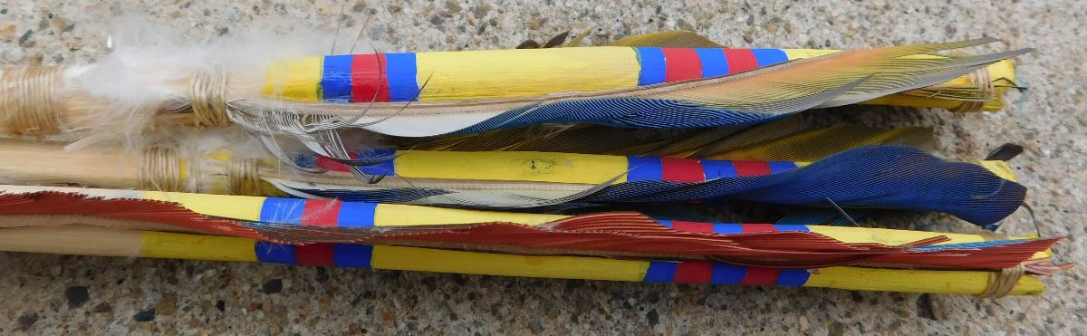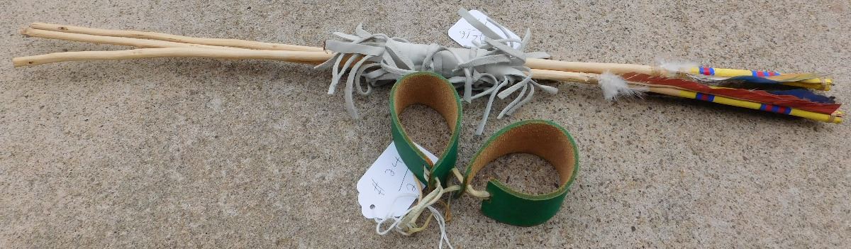 Hopi Dance Arrows and Cuffs from the 20th Century. Arrows are 27" and cuffs are 4 x 1 1/2 inches. Items are made of wood, feathers and leather with yellow, blue and red paint. Condition: Good, see images. Shipping: $22.50