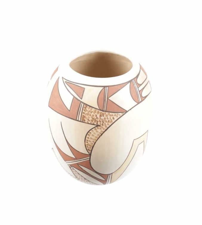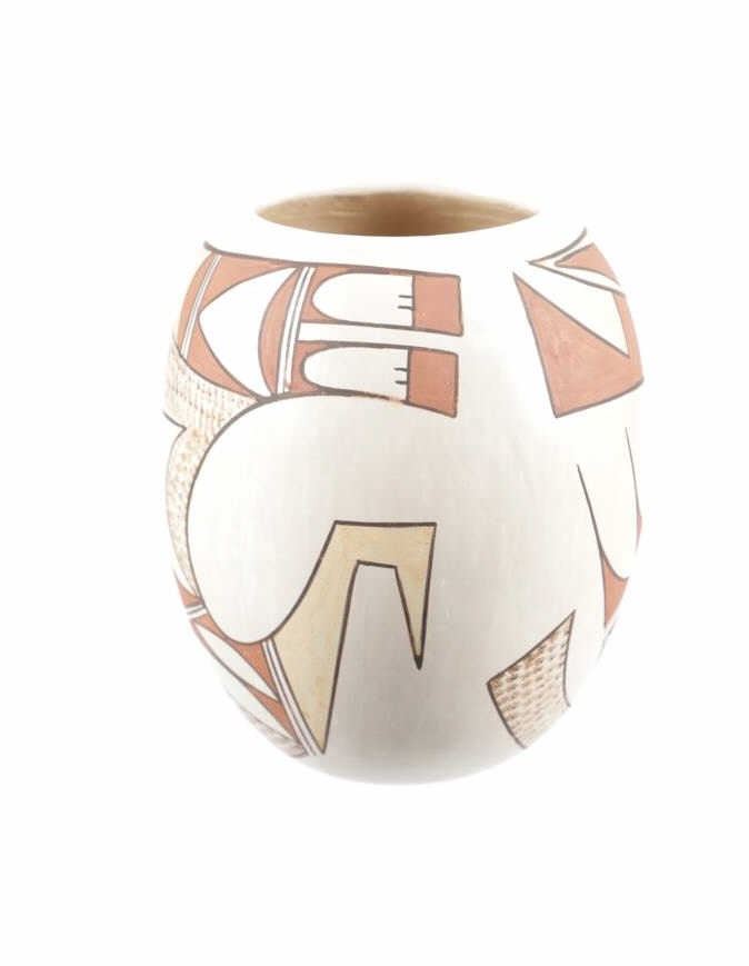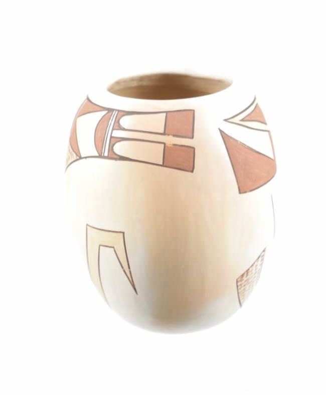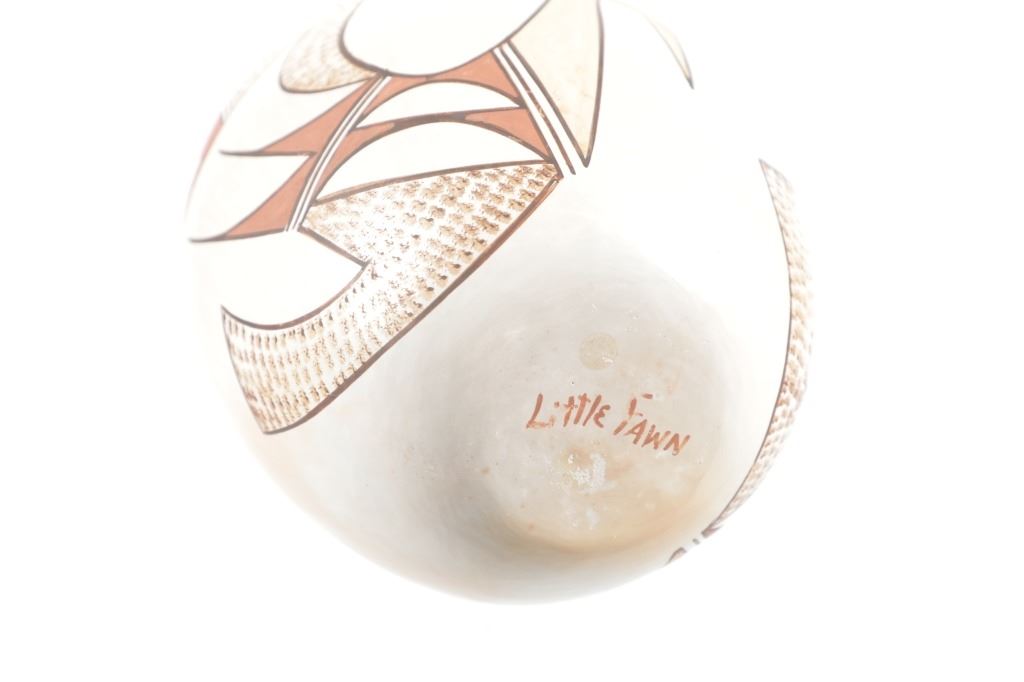 Featured in this lot is a beautiful, Hopi polychrome pottery vase made by Hopi member, Fawn Navasie-Garcia, formerly know as Little Fawn in the 1980-1990s. Fawn Navasie-Garcia was born in 1959 on the Hopi Reservation. Her late mother, the well-known "Eunice (original Fawn) Navasie," motivated her to carry on the family pottery legacy. Eunice taught Fawn the foundations of traditional Hopi pottery-making. Fawn has been producing pottery since 1979, specializing in exquisite polychrome buff or yellow slipped ceramics. Fawn coils come in a wide variety of shapes, including wedding vases, egg-shaped pots, and bowls. Her designs are inspired by the Sikyatki Ruins (a historic hamlet on the Hopi reserve located two miles north of First Mesa known for its golden dirt). The vase shows Southwest geometric designs throughout in colors of red / brown, beige and brown. It is signed on the bottom reading, "Little Fawn". The piece shows good condition overall with little to no wear present and no damage noted. It measures 5 1/4" L x 5 1/4" W x 6 5/8" H and weighs 1lb 4 oz.*