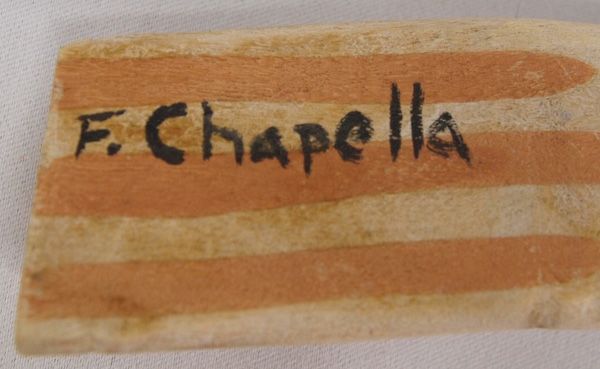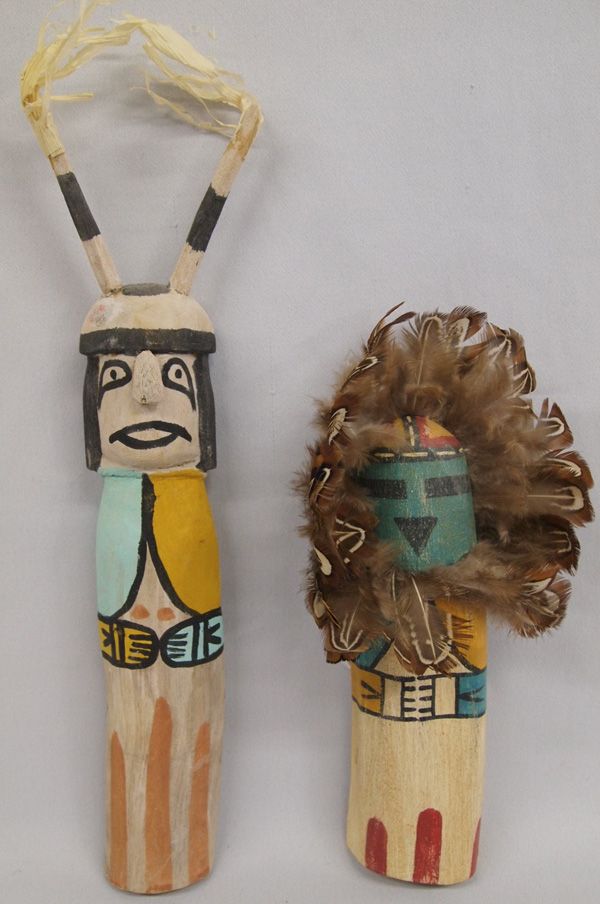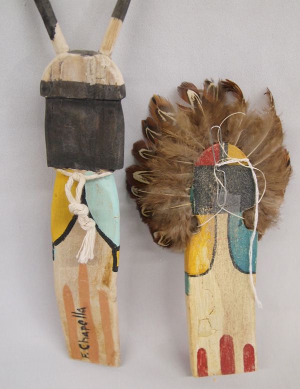 Hopi Flat Kachinas. The tallest kachina has a signature on the back, ''F. Chapella,'' and measures 12''H x 3''W. The smaller kachina has a feather headdress and measures 8'' long. These kachinas are made to hand on a wall or stand up on a shelf.
