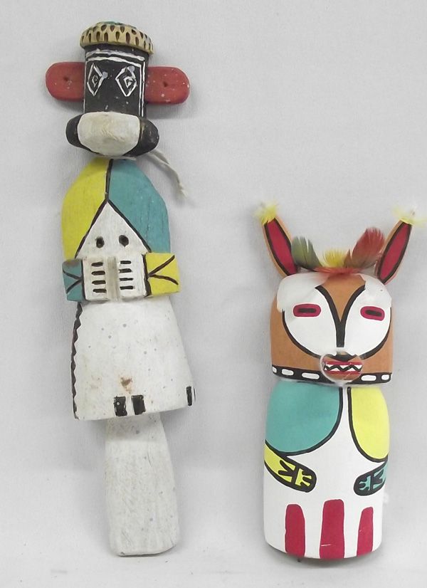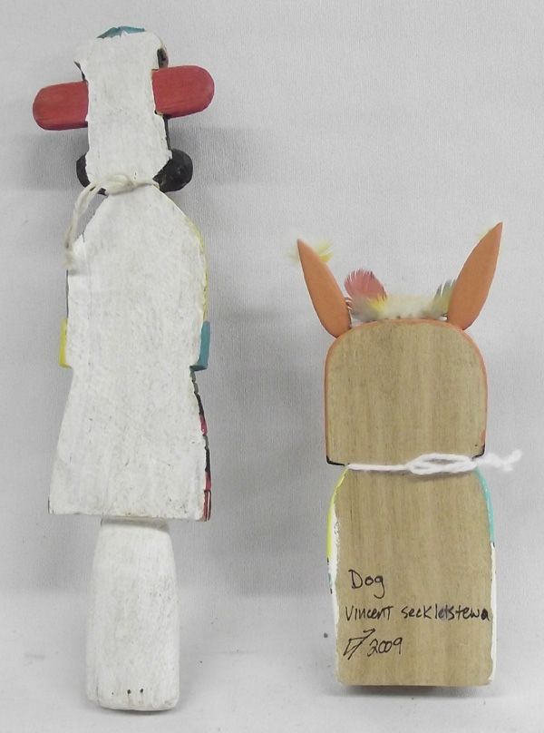 2 Hopi Flat Kachinas. The taller Kachina is an older one with a carved hand hold on the bottom. It measures 10''H x 2.25''W. The other Kachina is signed on the back, ''Dog Vincent Seekletstewa 2009''.