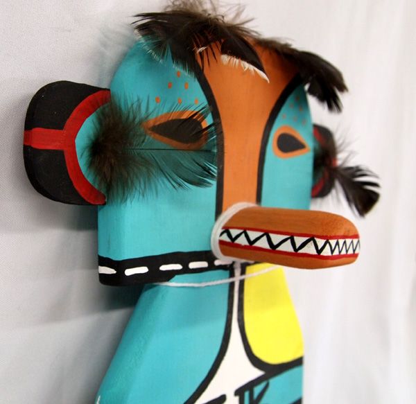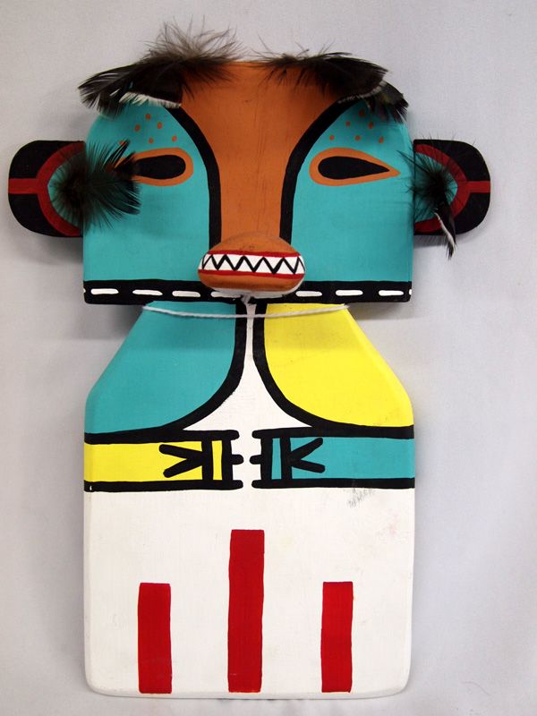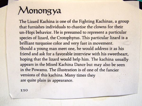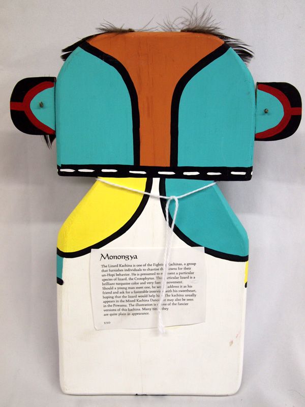 Hopi Flat Monongya Kachina. 15''H x 11''W, he is the LIzard Kachina. More information is on the back of the kachina. Symbol signed, '09 on bottom. A colorful fun kachina.