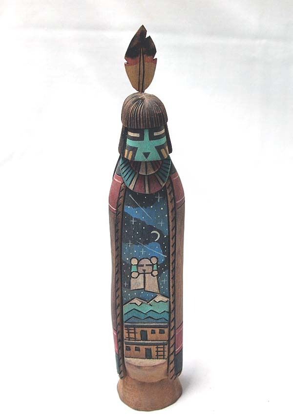 Native American Hopi Flute Player Kachina by Lawrence Charley II of Kykotsmovi Village (3rd Mesa) Arizona, Sun Clan, measures 2'' x 9'' x 2'' and is signed by the artist, beautifully carved with intricate details and hand painted