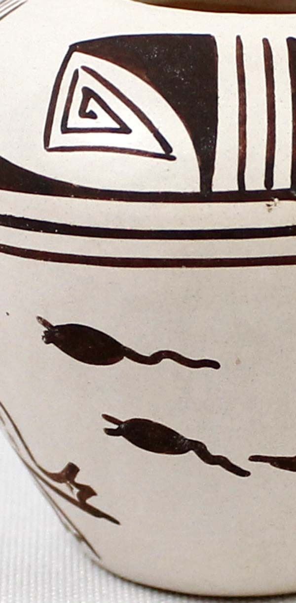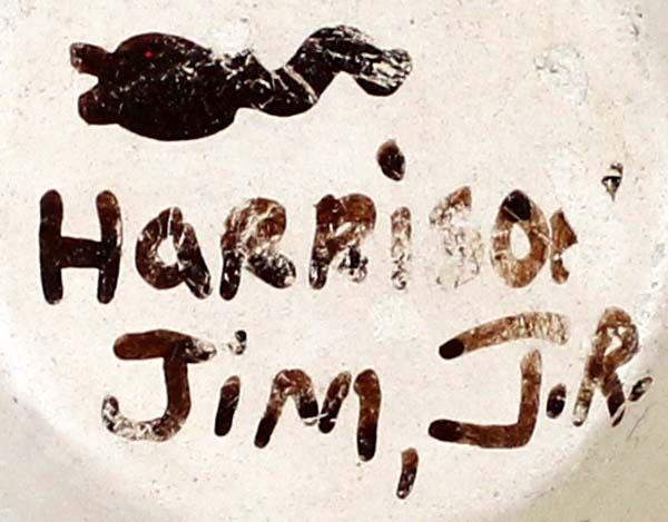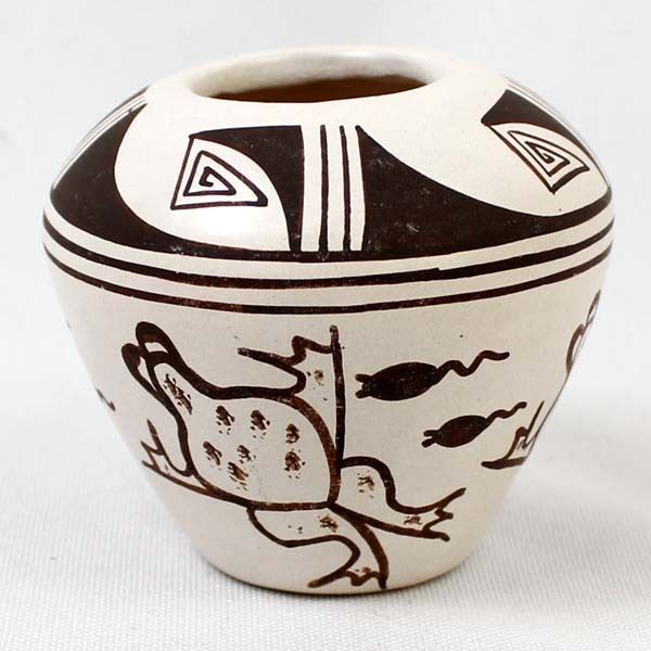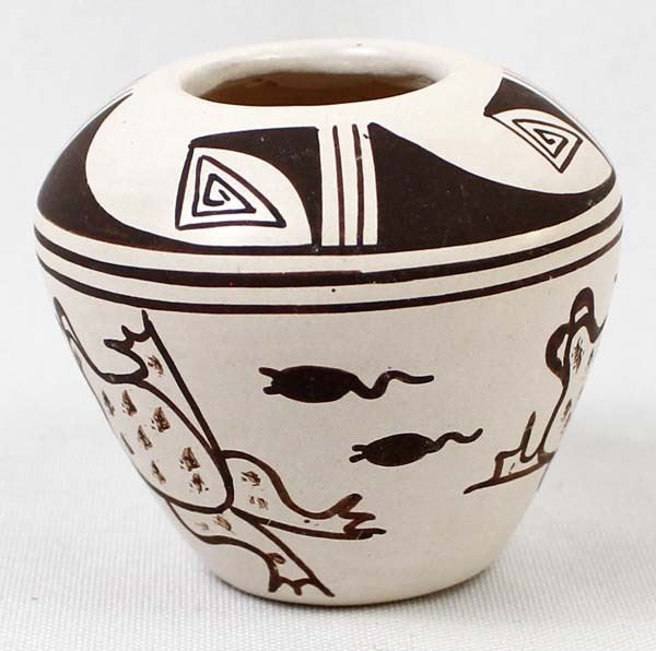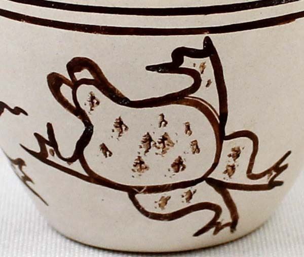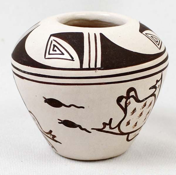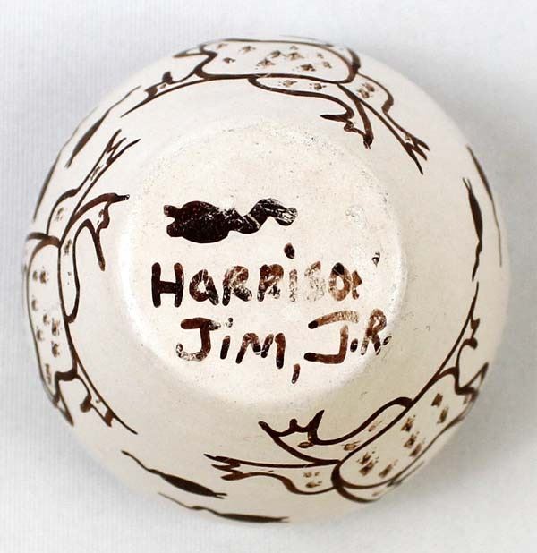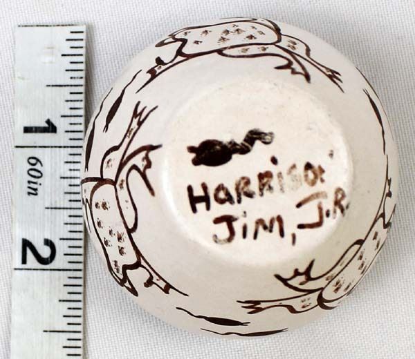 Native American Hopi Frog & Tadpole Pottery Jar by Harrison Jim, Jr., measures 2.5'' x 2.5'' and is signed on the bottom, nice thick walled pot, FYI: ''Harrison Jim Jr. comes from a long line of noted Hopi Potters (Frog Woman Family). He is the son of Marianne Navasie Jim. His grandmother was famous Hopi Potter Joy Navasie and his Great Grandmother was the original Frog Woman Paqua Naha.''