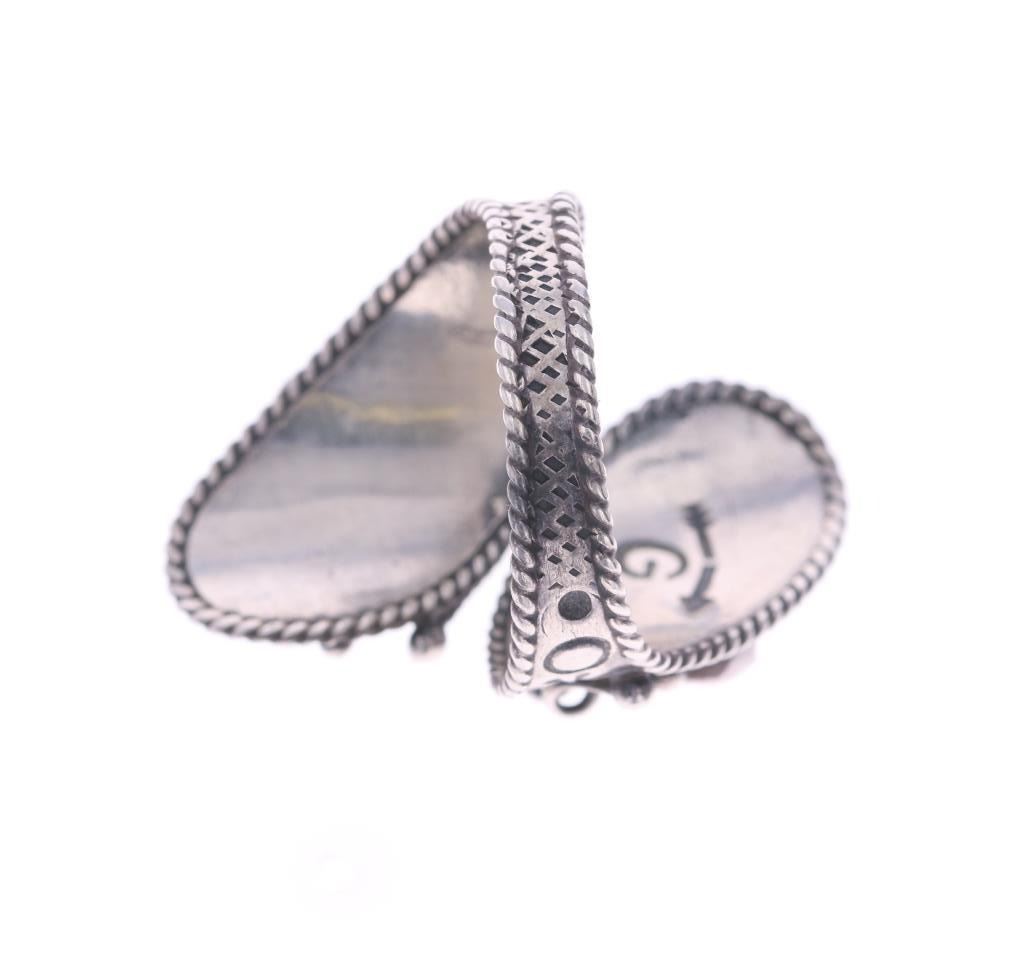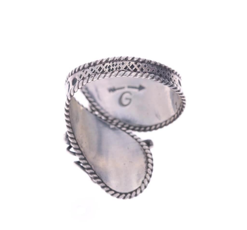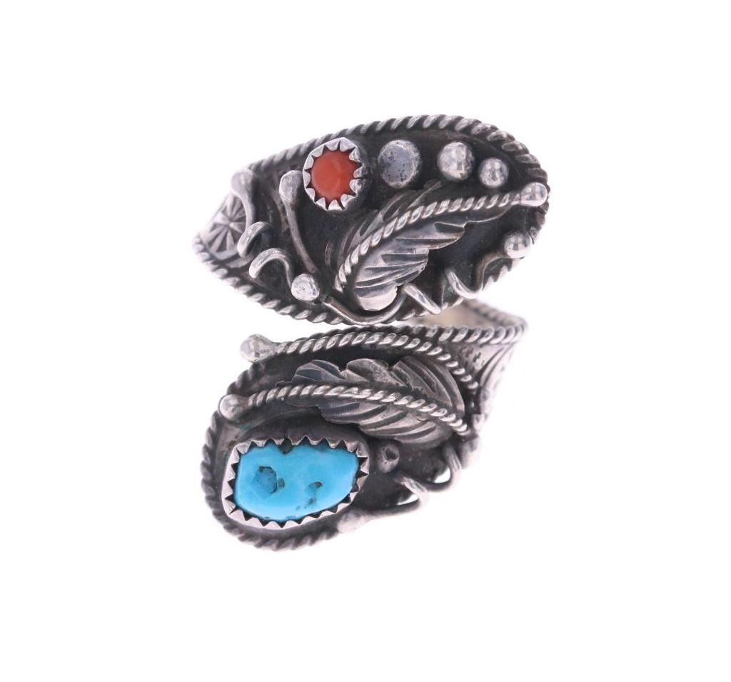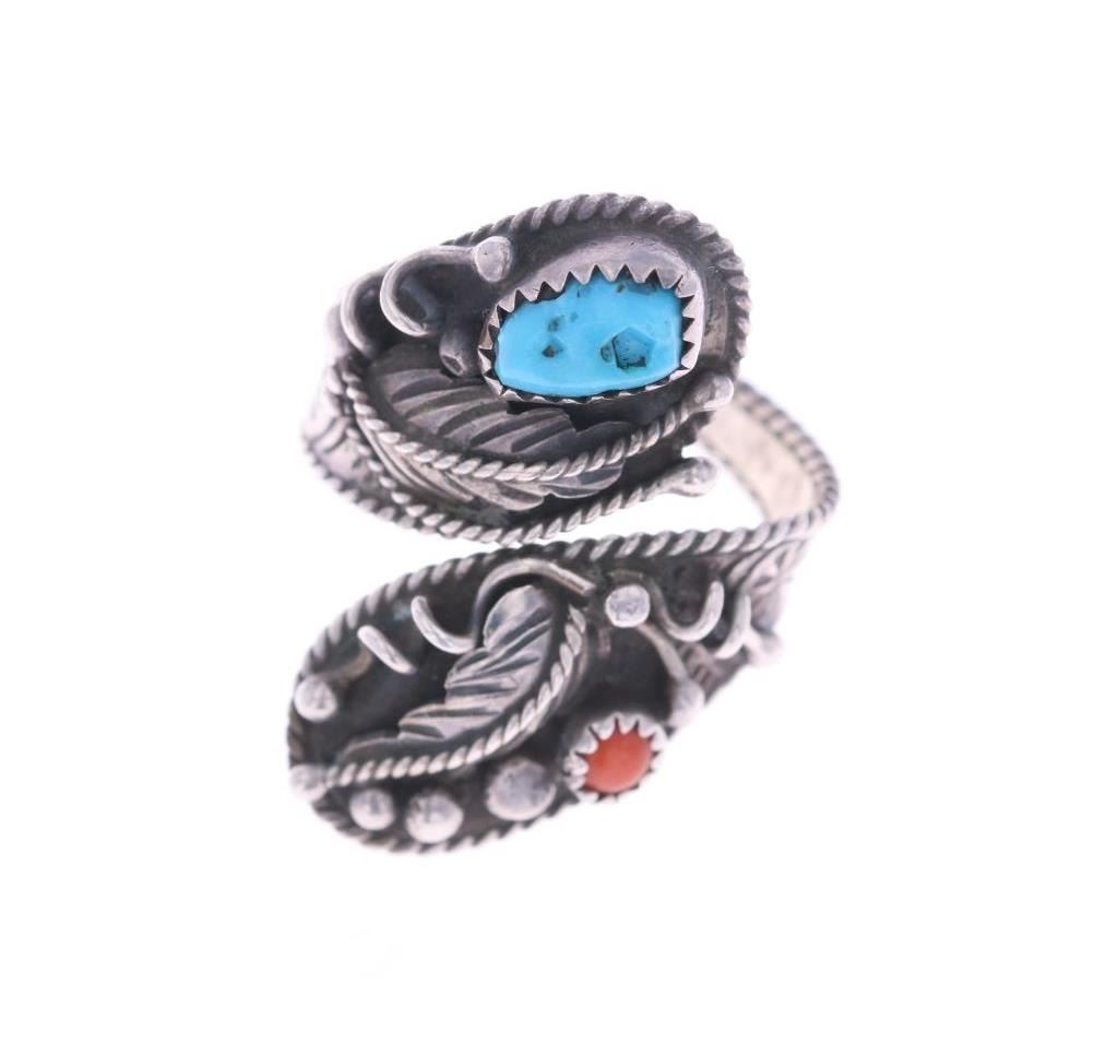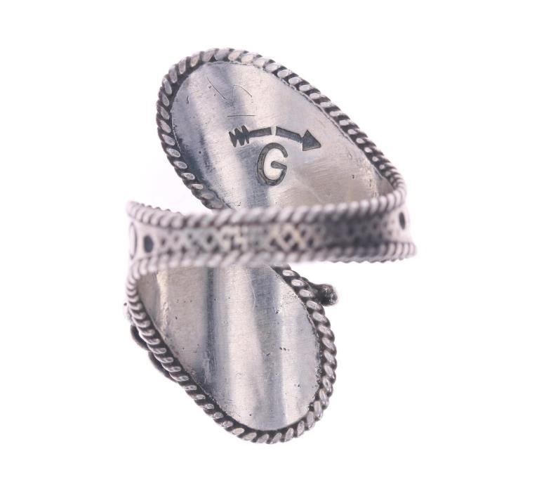 For your consideration is a Vintage Hopi George Phillips Turquoise and Spiny Oyster Silver Adjustable Ring, circa late 20th century. George Phillips is a Hopi Silversmith and a member of the Greasewood and Roadrunner clans. George grew up in Old Orabibi, a Navajo Village in northeastern Arizona, where he learned the art of working with silver from his brothers. Phillips is one of the first artists to use pottery designs in his jewelry. Ring is stamped with a "broken arrow" and "G" hallmark. This ring features a petit point spiny oyster stone and a small turquoise cabochon, both in serrated bezel settings with silver feathers, silver braid, silver bead and a stamped design. Adjustable men's sizes from 9-10.5, 1.25"L x 1"W, collective weight is 9.7gms.
