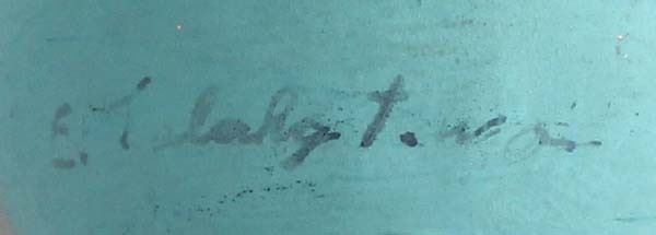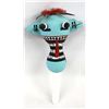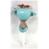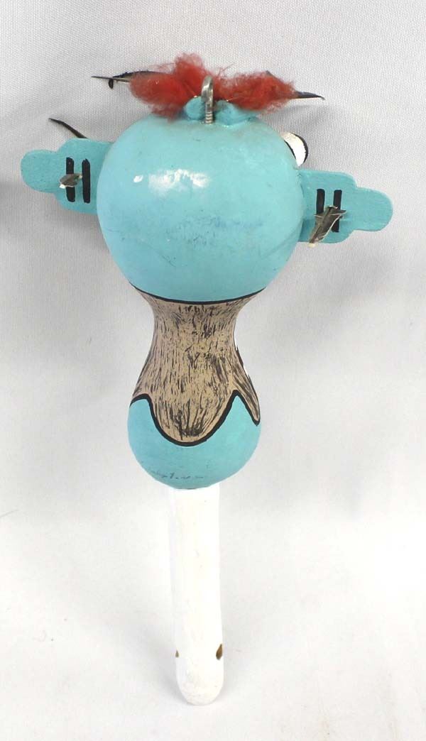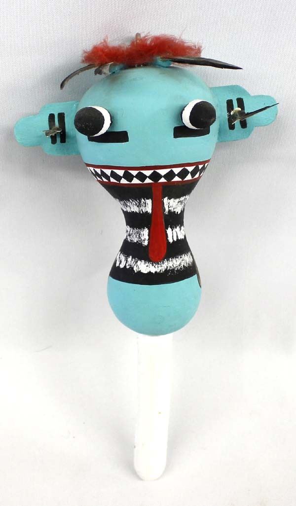 Native American Hopi Hand Painted Ogre Gourd Rattle by E. Talahytewa, measures 10''L x 5'' and signed by the artist, embellished with feathers