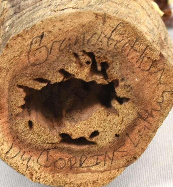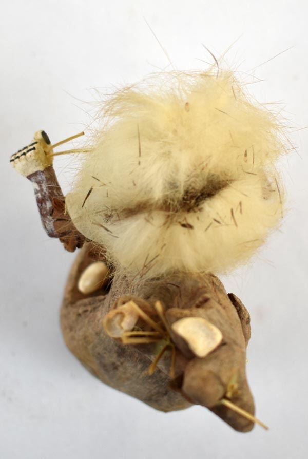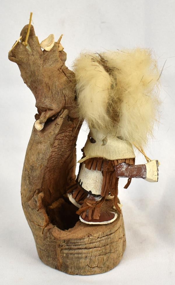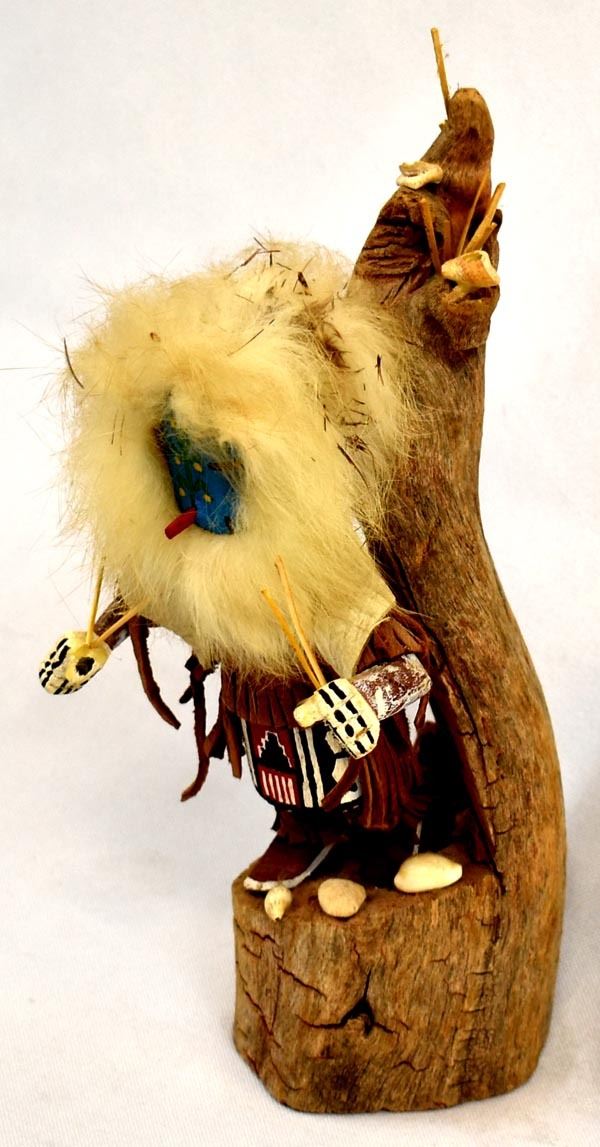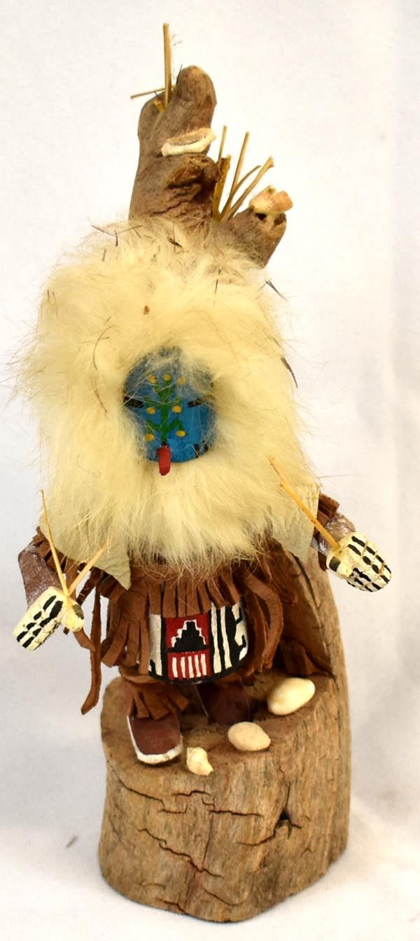 Native American Hopi Grandfather Kachina by Corrins Luther, measures 3.5'' x 8'' x 3.5'' and is signed on the bottom, embellished with shells, leather, and rabbit fur
