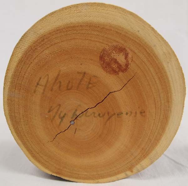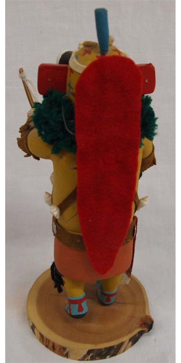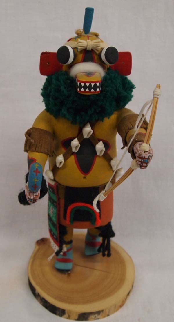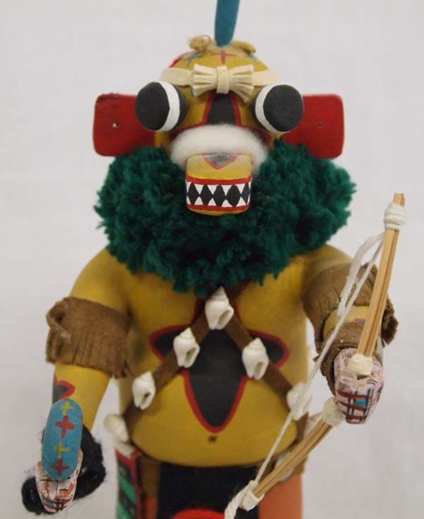 Hopi Hand Carved Yellow Ahote Kachina by Tyrone Duwyenie, measures 10''H, beautifully hand painted and carved by noted Hopi carver, embellished with yarn, felt, leather, shells, cotton, kachina is holding a rattle and bow, signed on bottom by artist A'hote is considered a good hunter. He may appear in any of the directional colors, the two most common being the Yellow (Sikyahote) or the Blue (Sakwahote).